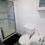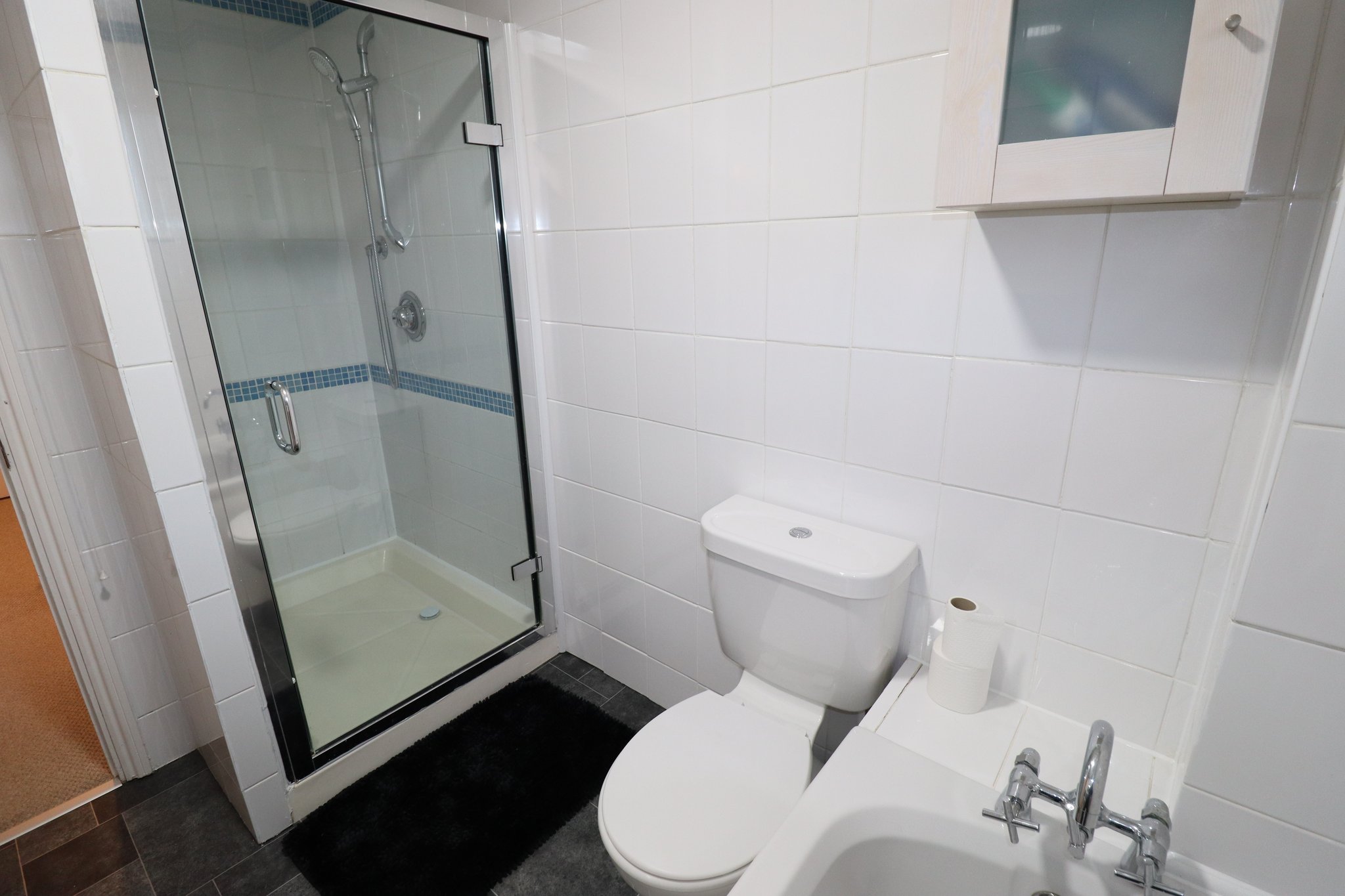 Four piece white suite, comprising of a low level WC with dual flush mechanism. Vanity hand wash basin with stainless steel mixer taps. Vanity cupboards under. Panel enclosed bath with stainless steel mixer taps and additional shower attachment. Large double walk in shower enclosure accessed via glass screen swing door with wall mounted mixer shower. Fully tiled walls. Vinyl flooring. Chrome heated towel rail. Extractor fan. UPVC double glazed obscured window to rear aspect. Spotlights.