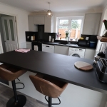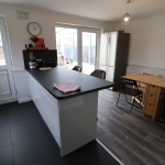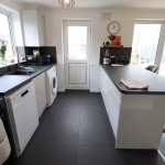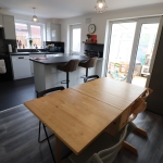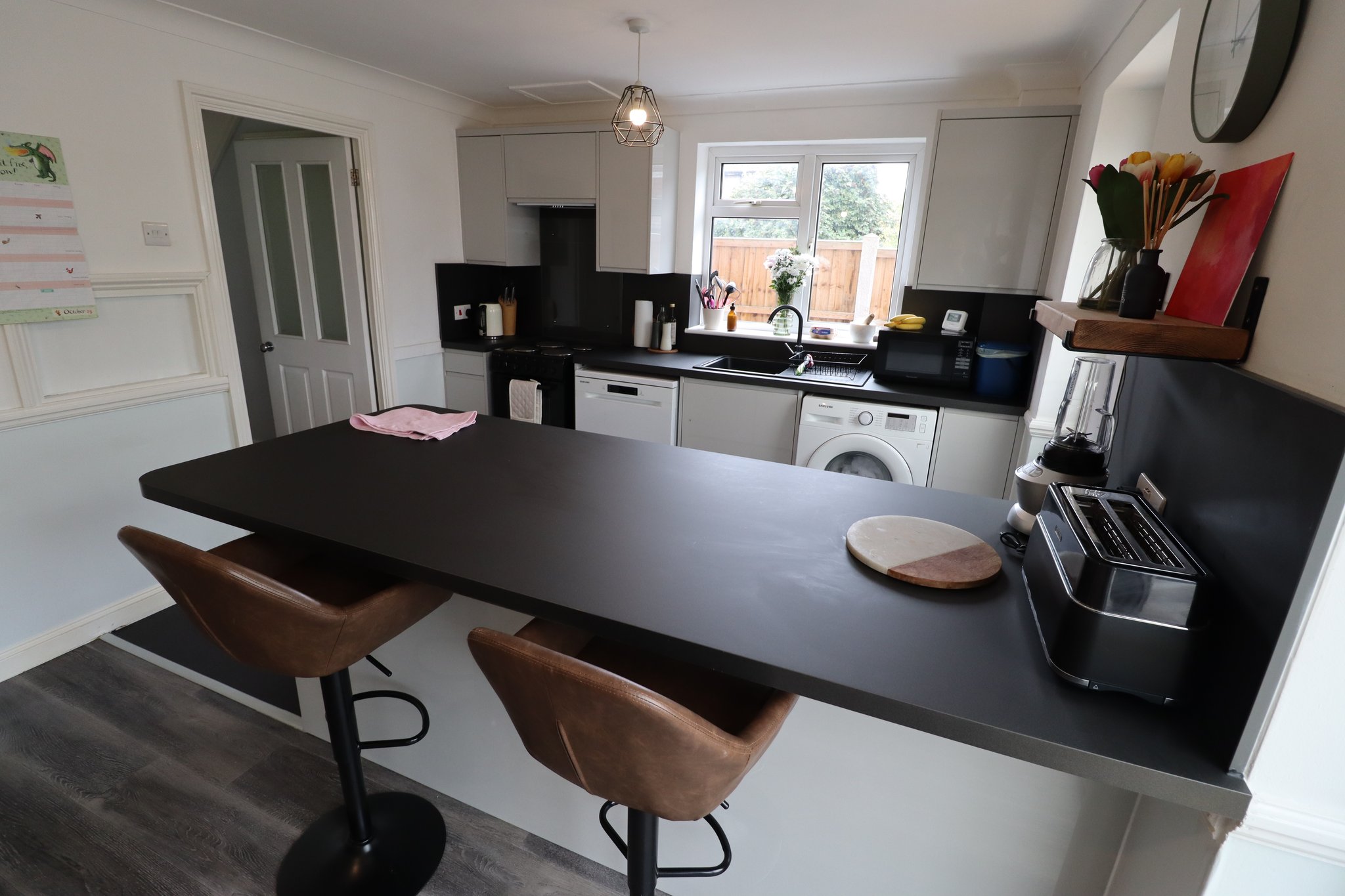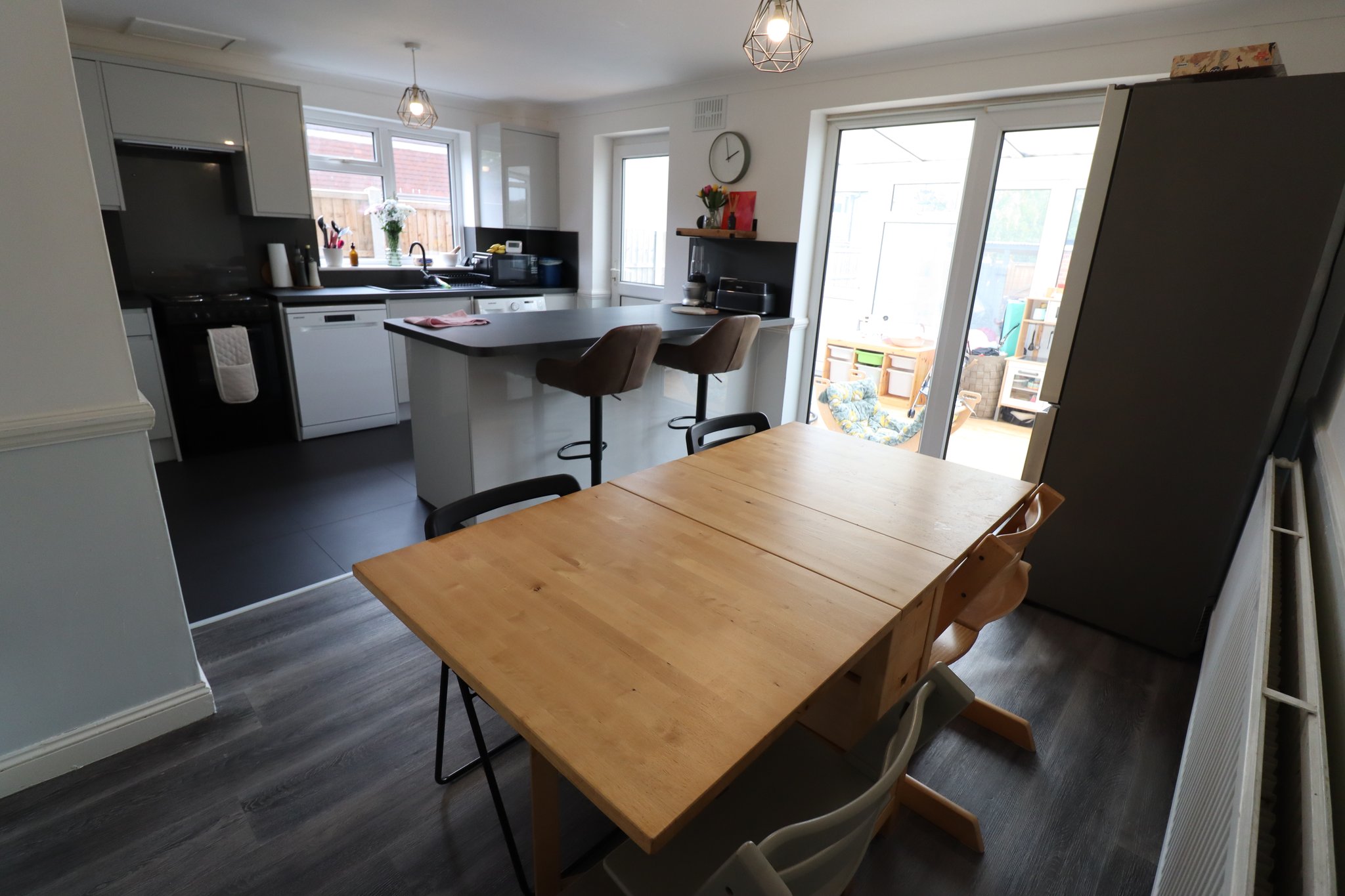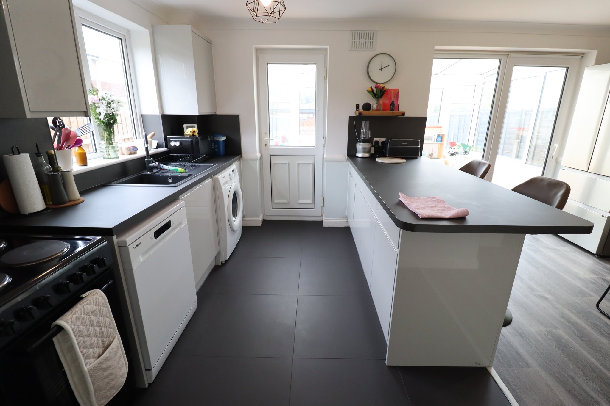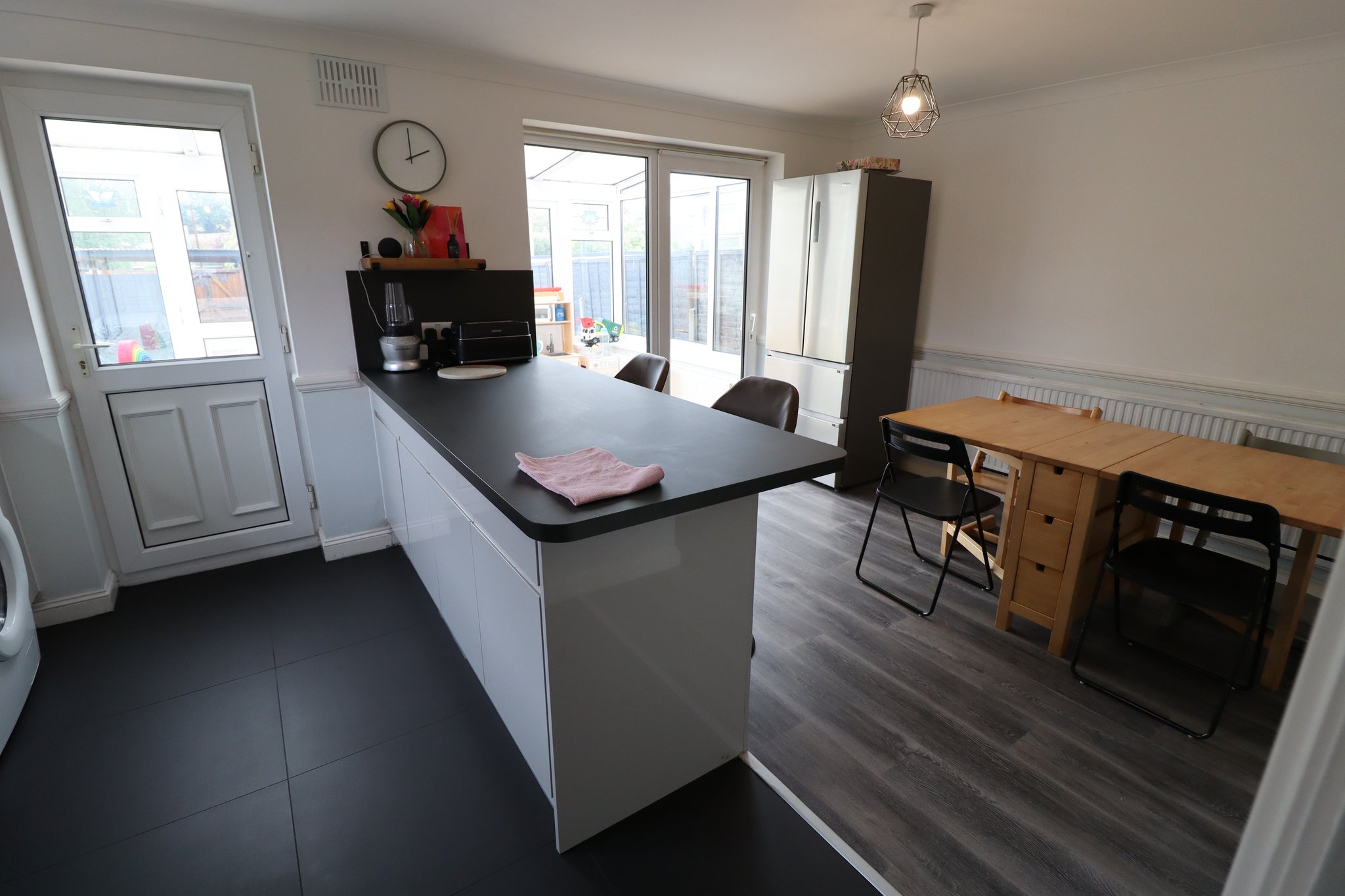 16' 10" x 13' 9" (5.13m x 4.19m) (MAX) Commencing with kitchen area: Range of kitchen units to eye & base level. Roll top work surface. Integrated one and a half bowl sink & drainer unit with stainless steel mixer taps. Space and plumbing for washing machine, dishwasher, and cooker. Integrated extractor hood over. Peninsula with ample seating under to one side, and plenty of storage to other. Part tiled walls. Fully tiled floor. Power points. UPVC double glazed windows to side aspect. Coved ceiling. UPVC double glazed door opening up to rear conservatory.