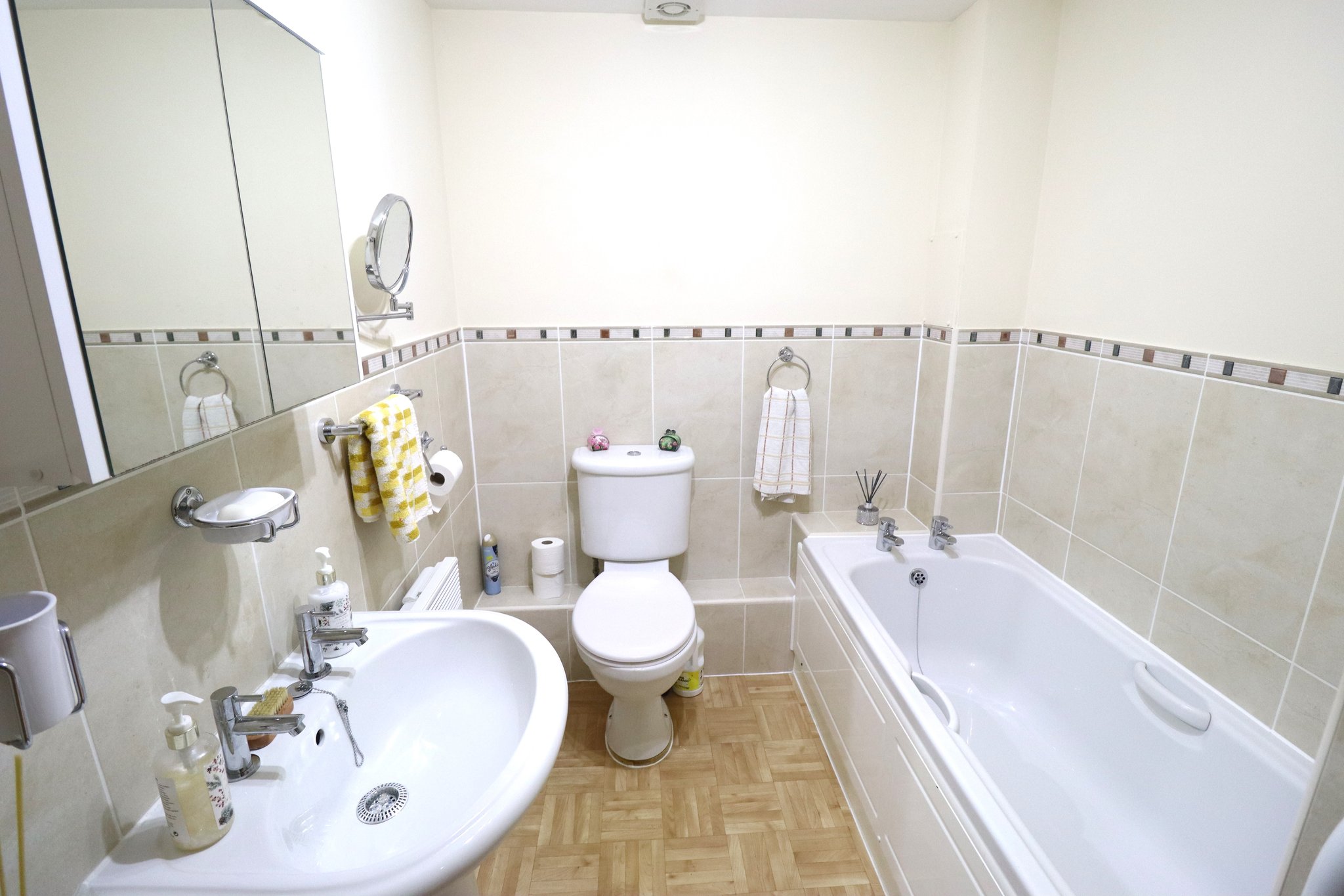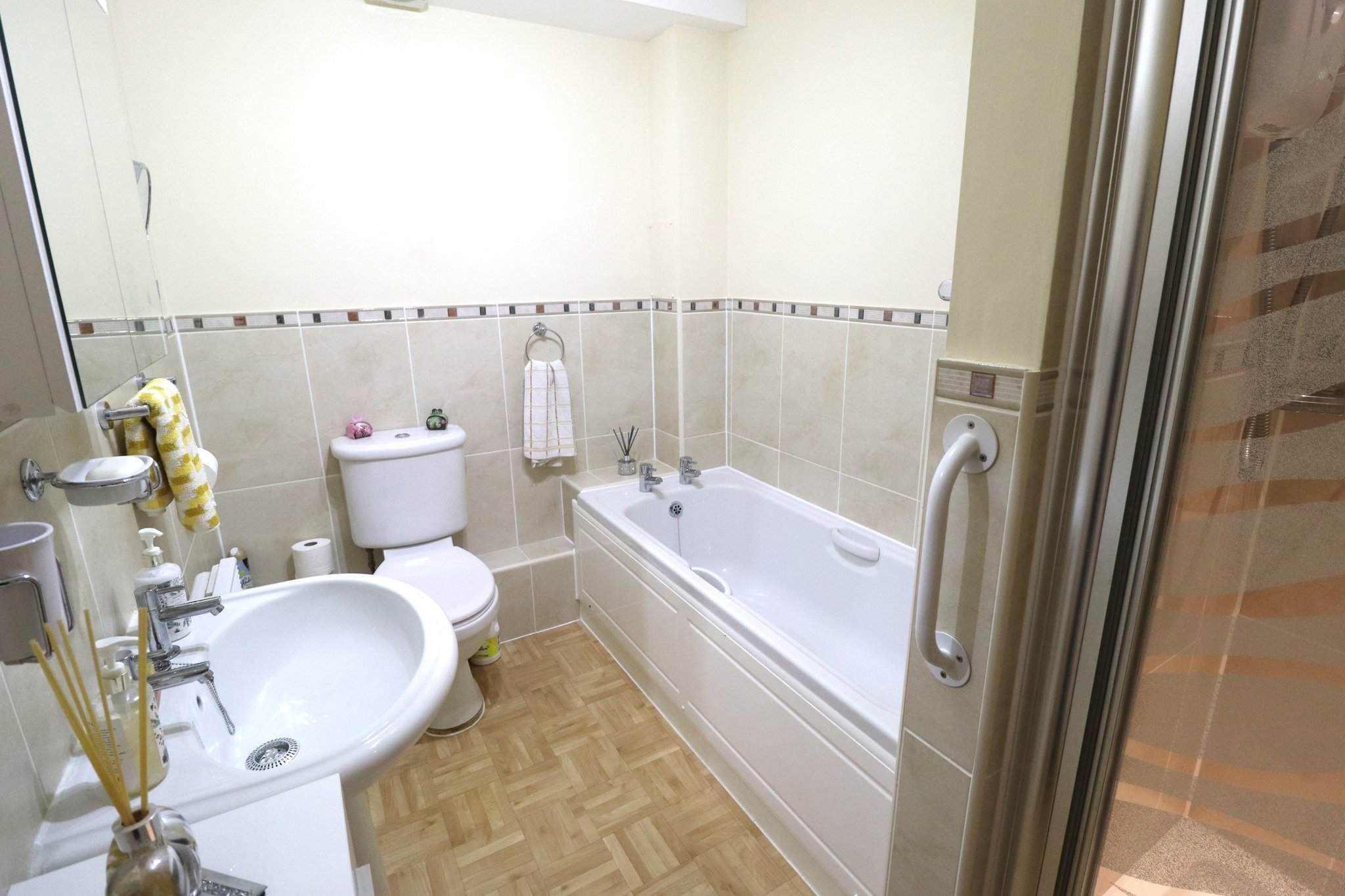 9' 0" x 6' 0" (2.74m x 1.83m) Large bathroom comprising of a four-piece suite to include: Hot and Cold Water Taps to Panelled Bath; WC; Hot and Cold Taps to Pedestal Basin; Separate Walk-in Shower; Lino Flooring; Part Tiled Walls; Wall-Mounted Mirrored Cabinet; Electric Heater.