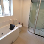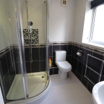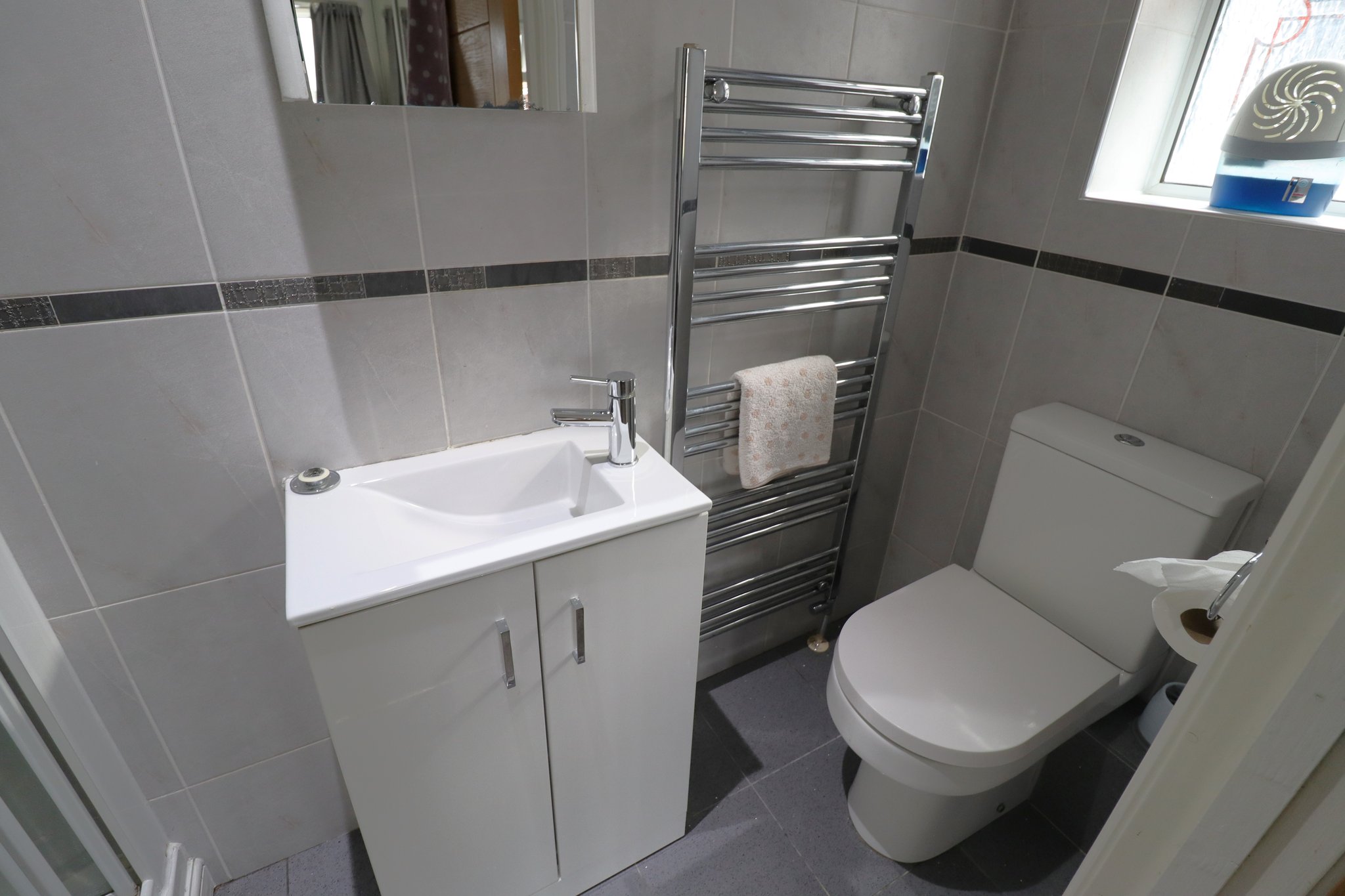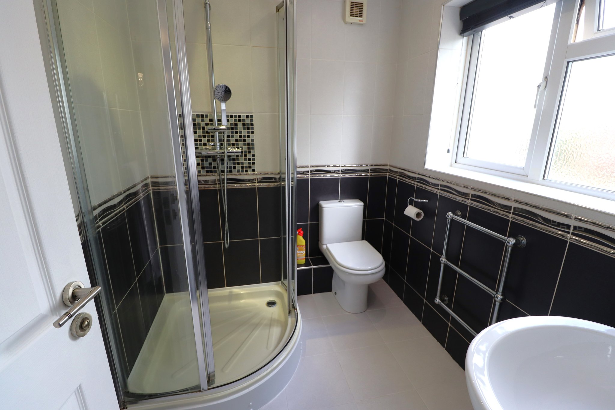 7' 0" x 5' 9" (2.13m x 1.75m) Obscure UPVC double glazed window to front aspect. Smooth plastered ceiling with inset spotlighting. Wall vented extractor. Full ceramic tiled walls with complimentary contrasting colour tiles with feature mid inlay border. Ceramic tiled flooring. Suite comprises of a corner shower unit with a thermostatic mixer shower inset with rainfall shower head and additional hand held hose. Push flush WC and pedestal wash basin with mixer tap. Chrome heated towel rail.