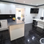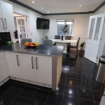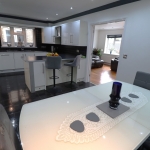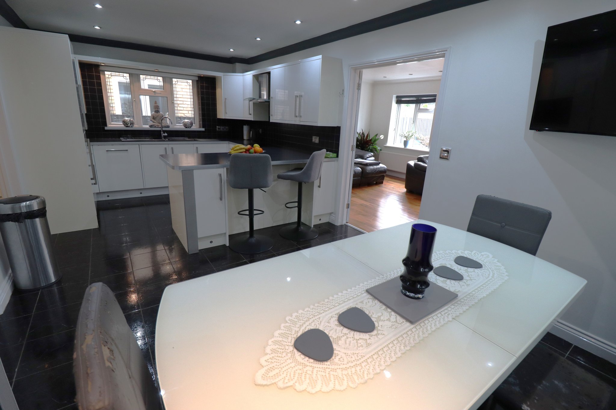 20' 4" x 10' 9" (6.20m x 3.28m) Dual aspect UPVC double glazed windows to both side aspects. Smooth plastered coved ceiling throughout with inset spotlighting. Wall mounted panelled radiator to dining area. Ceramic tiled flooring laid throughout. Kitchen area comprises of a range of wall mounted and base level modern gloss kitchen cabinet units and drawers. Ceramic tiling to three aspects. Four ring Electric Samsung induction hob, with stainless steel extractor over. Integral Bosch oven beneath. One and a half bowl graphite sink unit with mixer tap over, drainer inset to worktop. Integral fridge/freezer and integral dishwasher. Low level kick board LED lighting. Breakfast bar area. Inner door through to utility room.