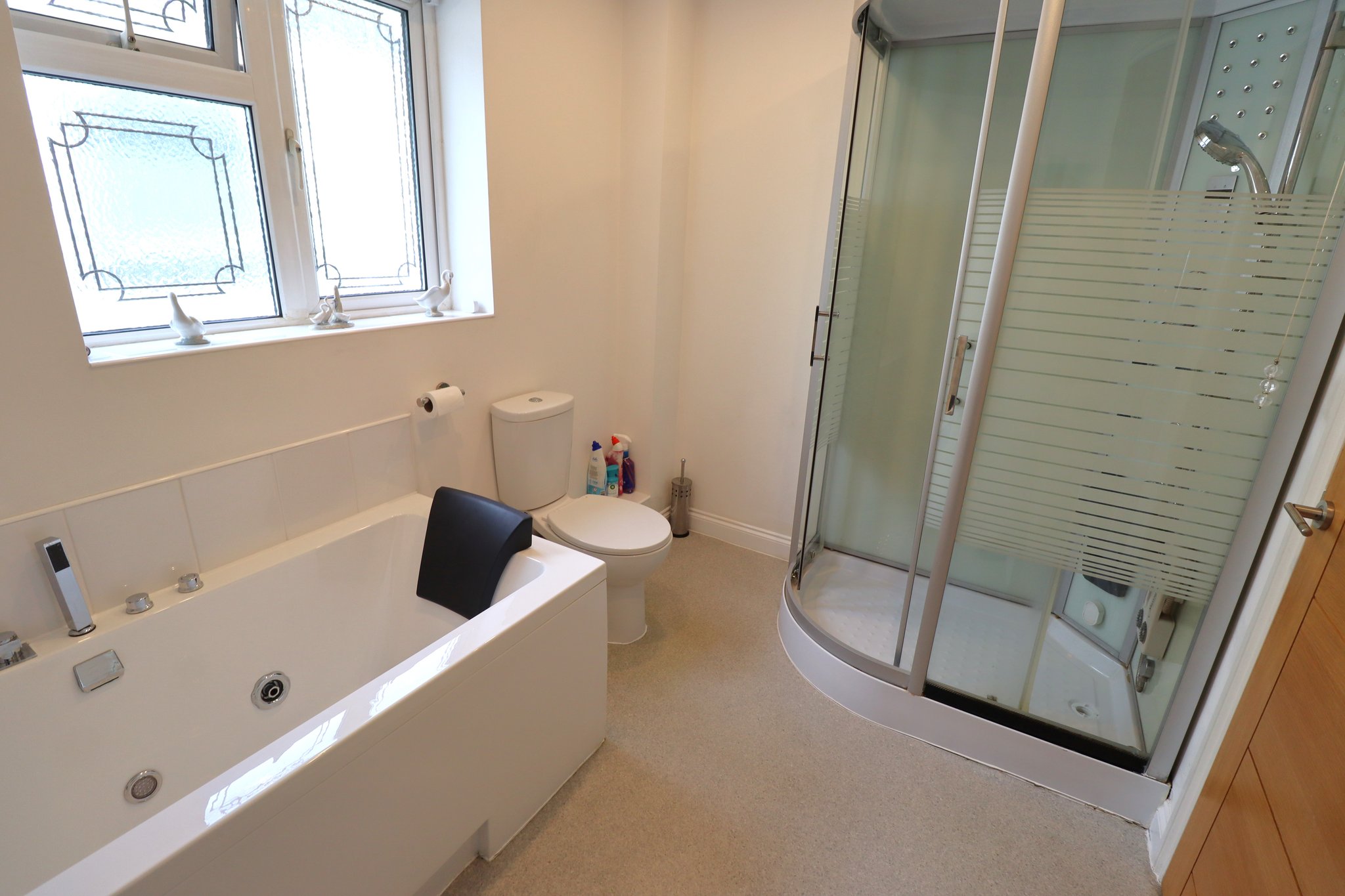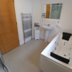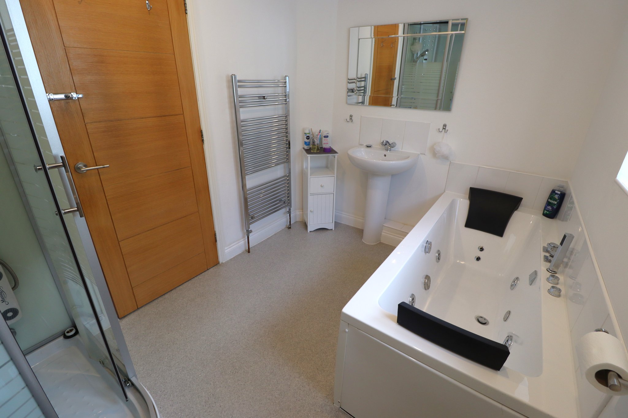 9' 10" x 6' 11" (3.00m x 2.11m) Obscure UPVC double glazed window to side aspect. Smooth plastered ceiling with inset spotlighting. Suite comprises of a Jacuzzi style spa bath with retractable shower hose and mixer tap bath controls. Ceramic tiled splashback. Pedestal washbasin with mixer tap and ceramic tiled splashback. Push flush WC. Double feature spa style massage shower unit with inset lighting and various controls and modes. Chrome heated towel rail and vinyl flooring laid throughout.