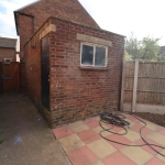 Wedge shaped garden. Timber fenced boundaries and side access from front. Mainly laid to lawn. Large brick built storage shed measuring 7' 11" x 7' 4" (2.41m x 2.24m).