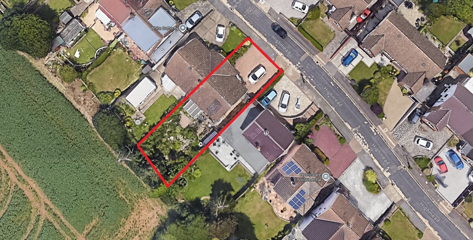 Tiered garden backing onto farmland with a mix of block paving, Indian sandstone and stepping stones. There is a wide side area housing garden shed and gated access to the front .