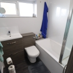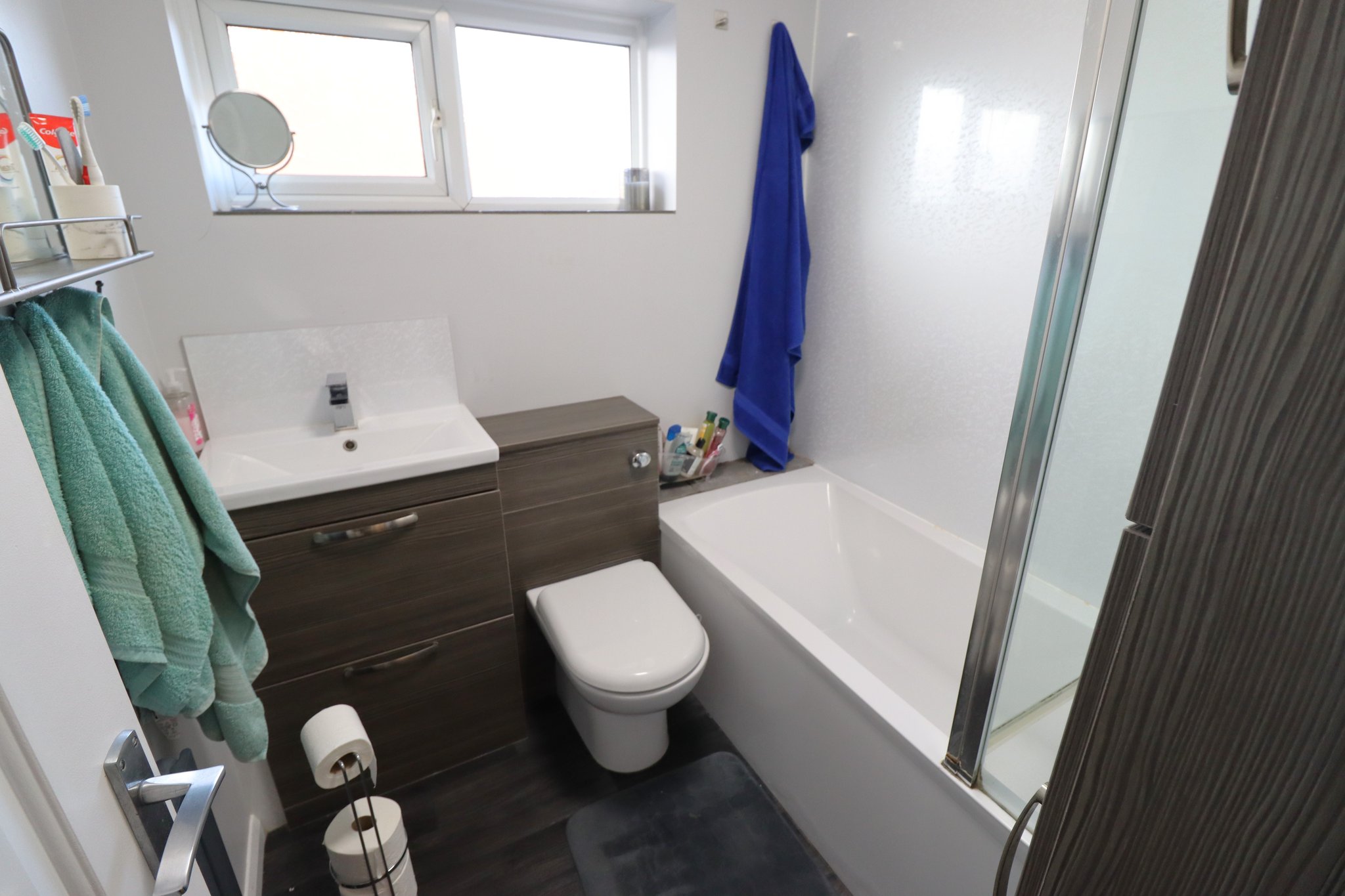 6' 1" x 6' 1" (1.85m x 1.85m) Obscure double glazed window to rear aspect. Smooth plastered ceiling. Panelled bath with mixer tap and shower over. Fitted glass shower screen. Concealed cistern WC with vanity unit finished in a woodgrain effect also incorporating wash basin with mixer tap. Wood effect vinyl flooring. Wall mounted panelled radiator.