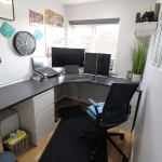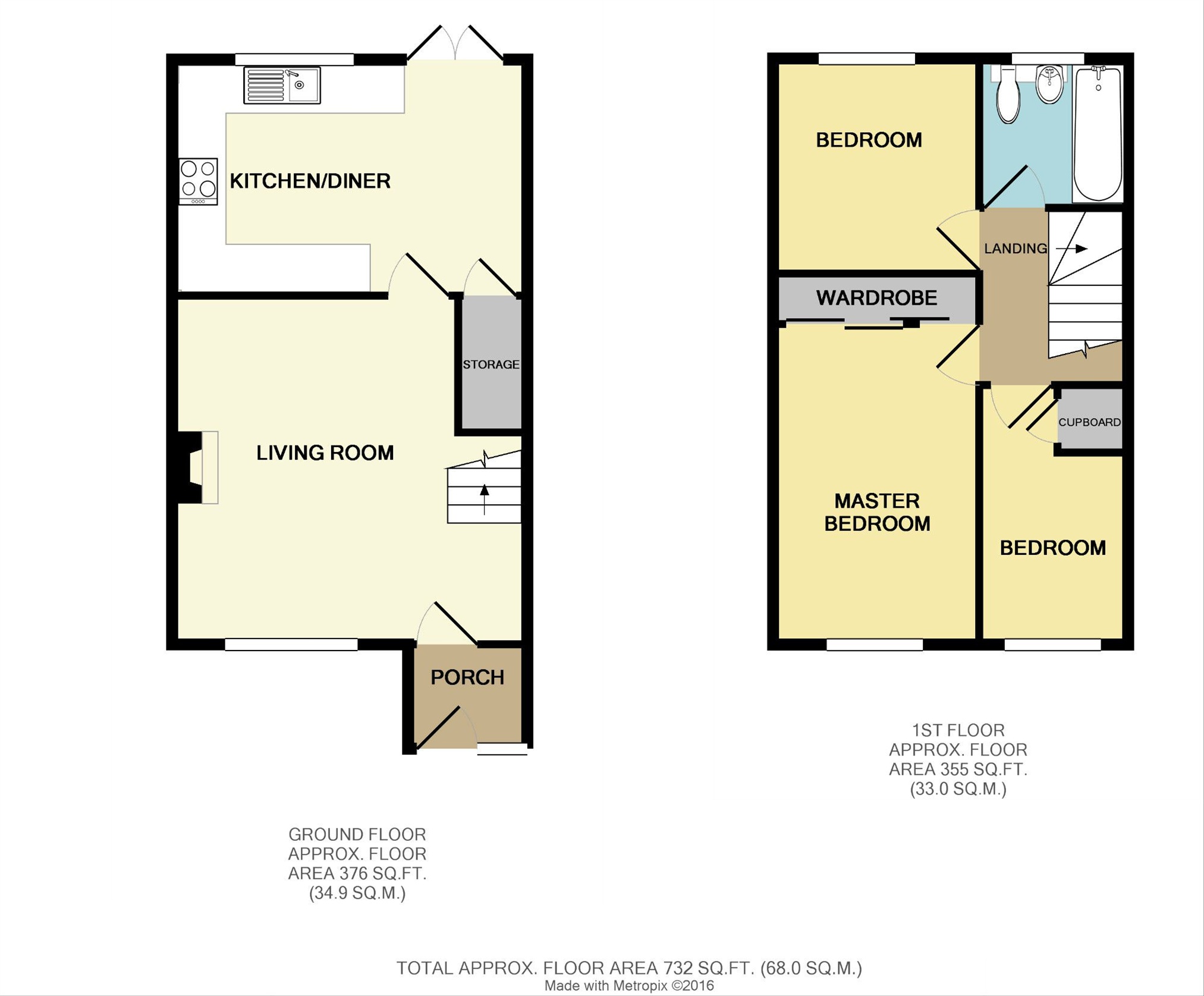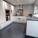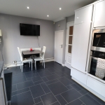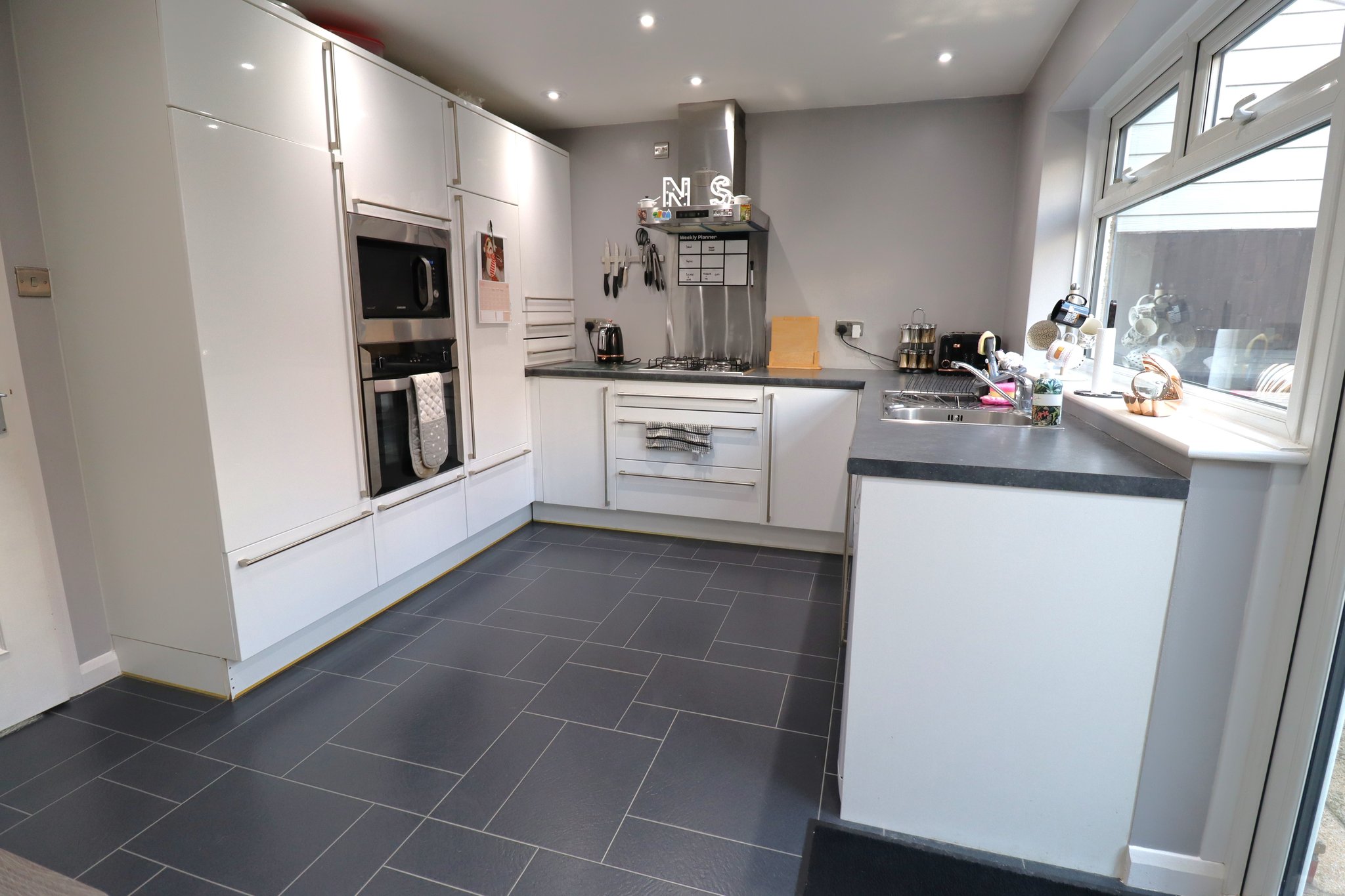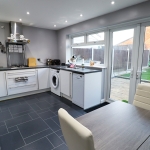 14' 8" x 9' 9" (4.47m x 2.97m) UPVC double glazed window and double opening patio doors to garden. Smooth plastered ceiling with inset spot lights. Wall mounted panelled radiator to dining area. Built in under-stairs storage cupboard. Contemporary laminate tiled flooring throughout. Kitchen comprises; Range of high gloss white units and drawers with integral appliances including; fridge, freezer, 'Baumatic' oven and a four ring gas hob inset to work top with a digital extractor hood over. Space and plumbing for washing machine and slim-line dishwasher.