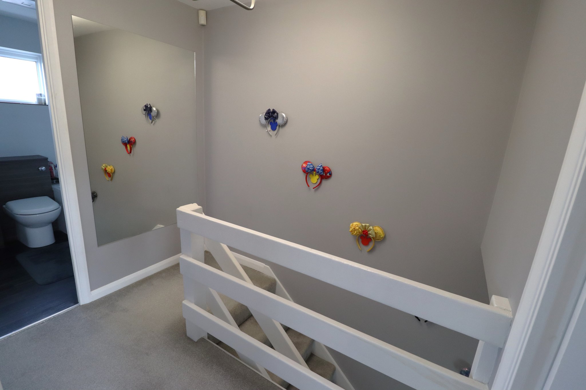10' 9" x 6' narrows to 2' 8" (3.28m x 1.83m) UPVC double glazed window to front aspect with partial views of farmland. Wall mounted panelled radiator. Wood laminate flooring. Built in storage cupboard over stairs.