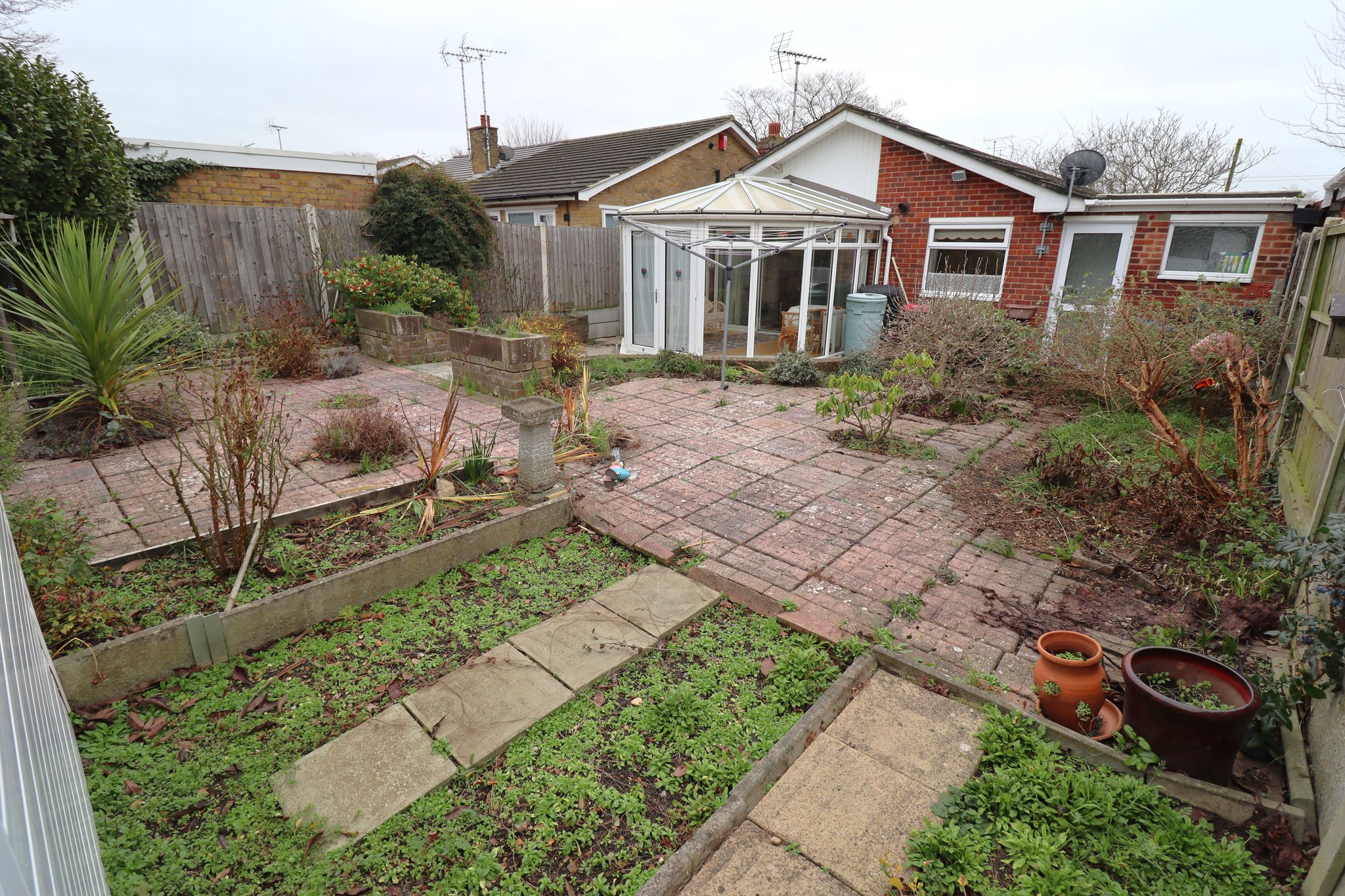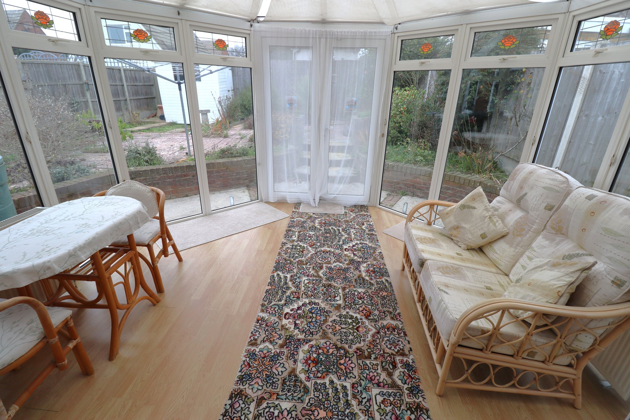 11' 10" x 10' 1" (3.61m x 3.07m) Pitched semi transcalent poly-carbonite conservatory roof with ceiling light fan and fitted blinds. Free standing radiators x 2. Wood laminate flooring. Double glazed, double opening patio doors to garden. Two wall mounted light points.