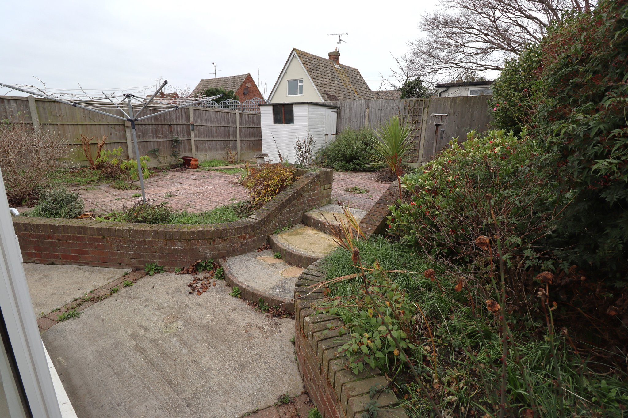 Low maintenance landscaped garden commences with a paved patio area with inlaid block paving. Raised brick retaining flower beds with steps up to elevated tiered garden. Array of various shrubs, trees and bushes. Timber fenced boundaries. Garden shed. Gated side access to front. External water tap.