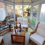 9' 10" x 9' 2" (3.00m x 2.79m) UPVC double glazed Victorian style pitched roof conservatory. Semi translucent poly-carbonate roof and double doors opening to garden.