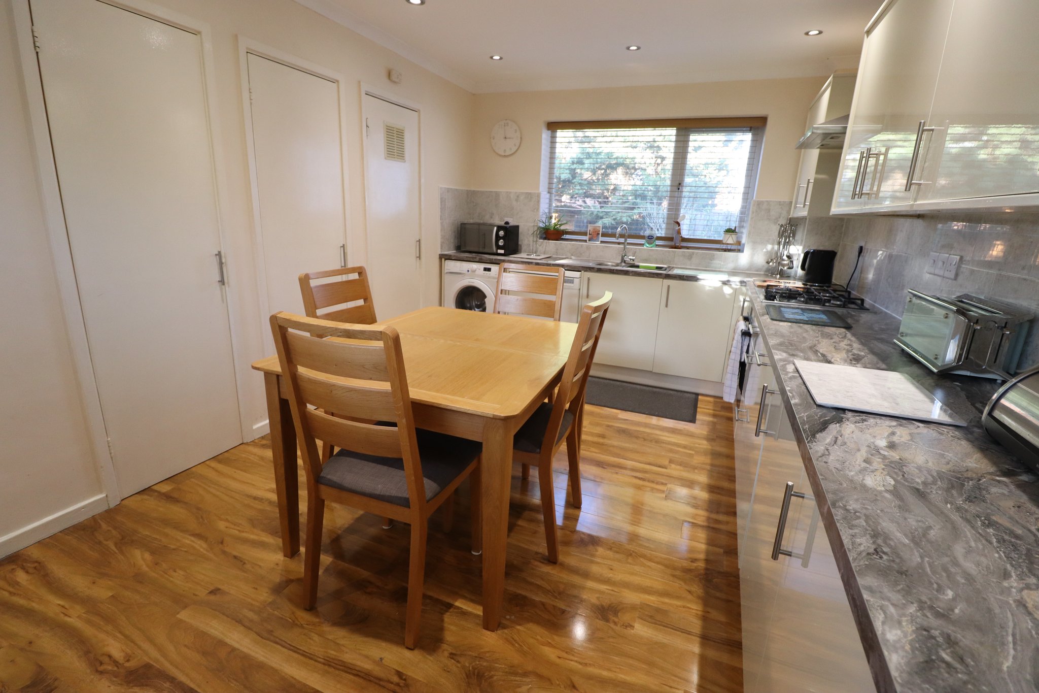 15' 3" x 9' 11" plus door recess of 2'4'' Dual aspect double glazed windows to front and rear. Smooth plastered coved ceiling with inset LED spotlighting. Range of wall mounted and base level contemporary gloss kitchen cabinet & drawer units. Marble effect worktops incorporating a four ring gas hob with stainless steel extractor hood over, integral Bosch oven beneath. One and a half bowl sink unit with mixer tap & drainer. Space for free standing fridge/freezer. Space & plumbing for dishwasher and washing machine. Gloss walnut effect laminate flooring laid throughout. Wall mounted double banked panelled. Three individual cupboards, one housing a modern Worcester Bosch boiler.