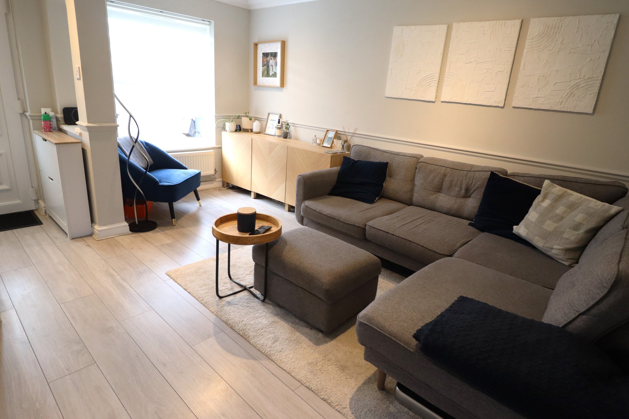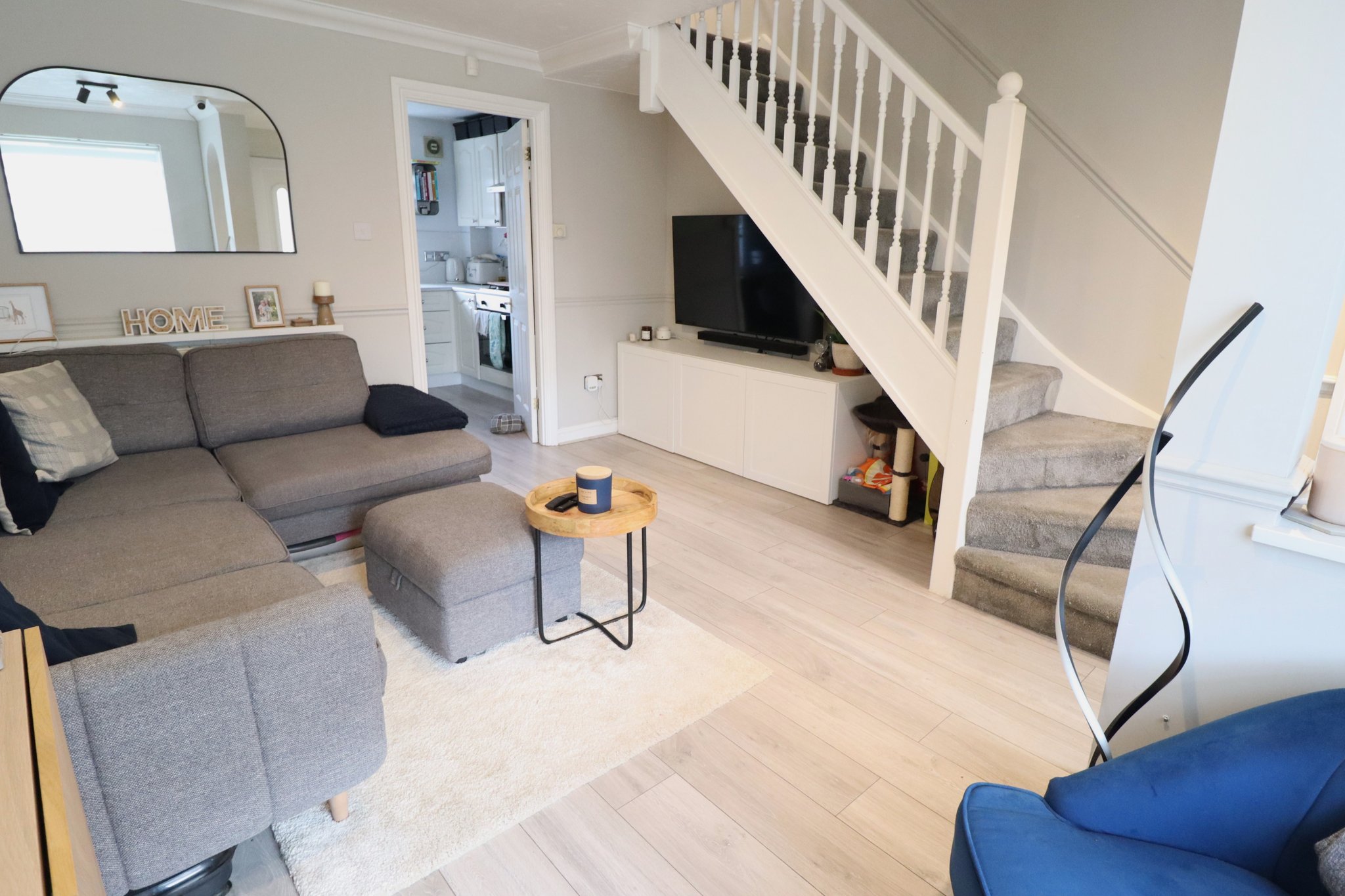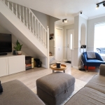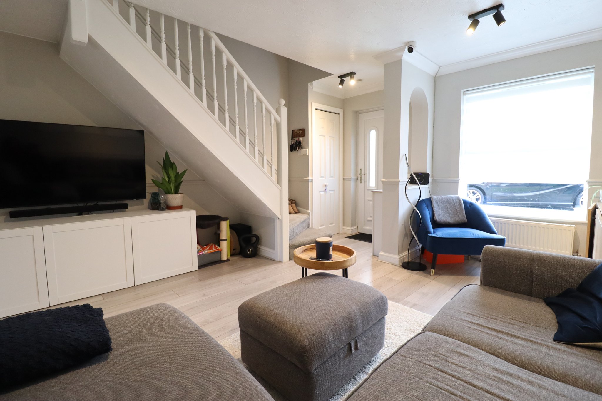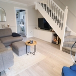 14' 4" x 12' 9" (4.37m x 3.89m) Light and Bright Living Space with: Laminate Flooring; Double Glazed Window to Front Aspect; Two Radiators; Built-in Storage Cupboard; Ceiling Light Fittings; Stairs to Upper Floor.