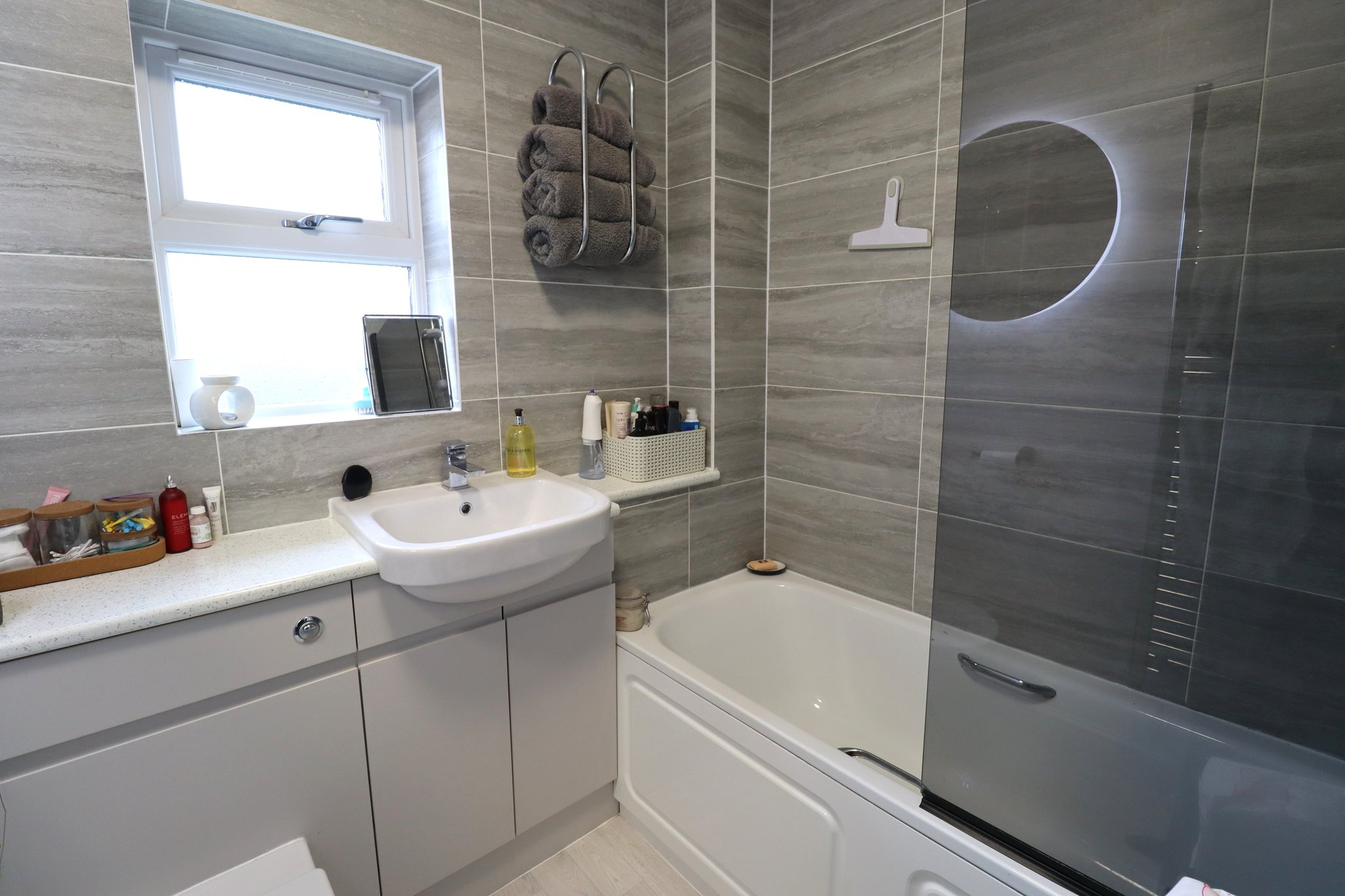 6' 5" x 6' 2" (1.96m x 1.88m) Modern Bathroom Re-Fit in 2023 to included: Panelled Bath with Electric Wall-Mounted Shower; Glass Shower Screen; Mixer Tap to Basin; WC; Contemporary Vanity Unit; Wall-Mounted Towel Radiator; Fully Tiled Walls; Laminate Flooring.