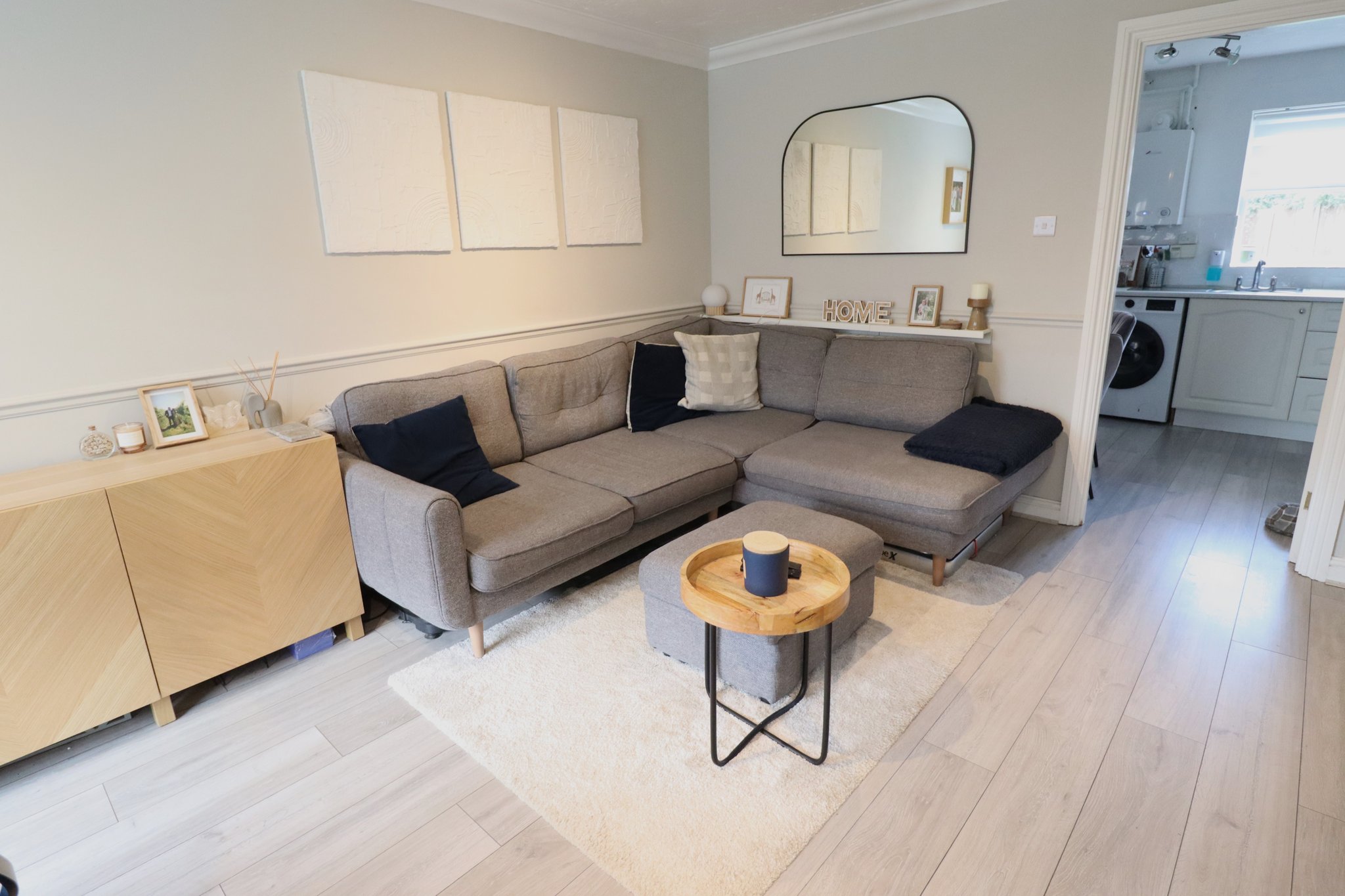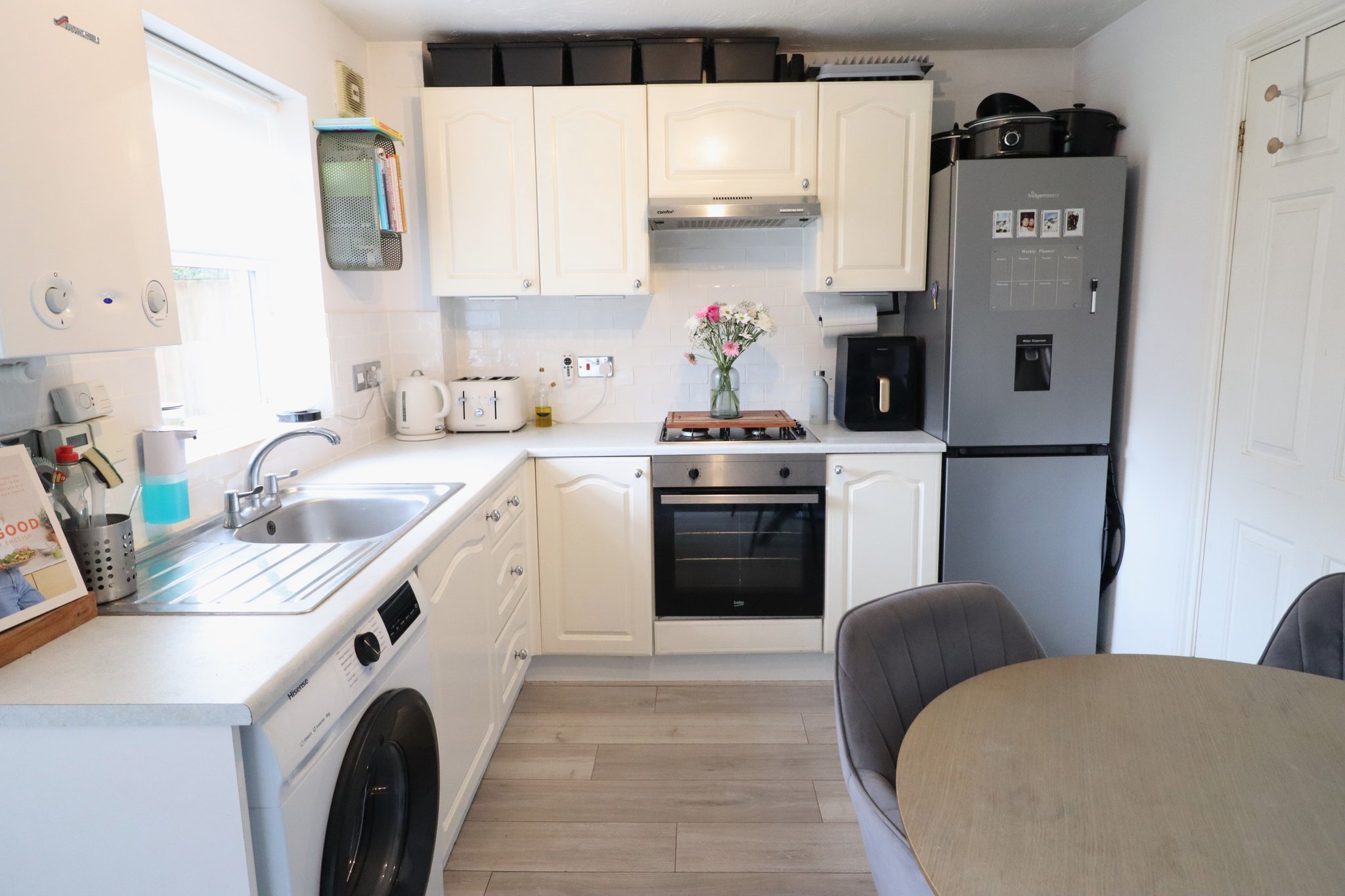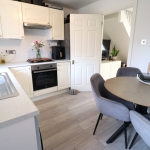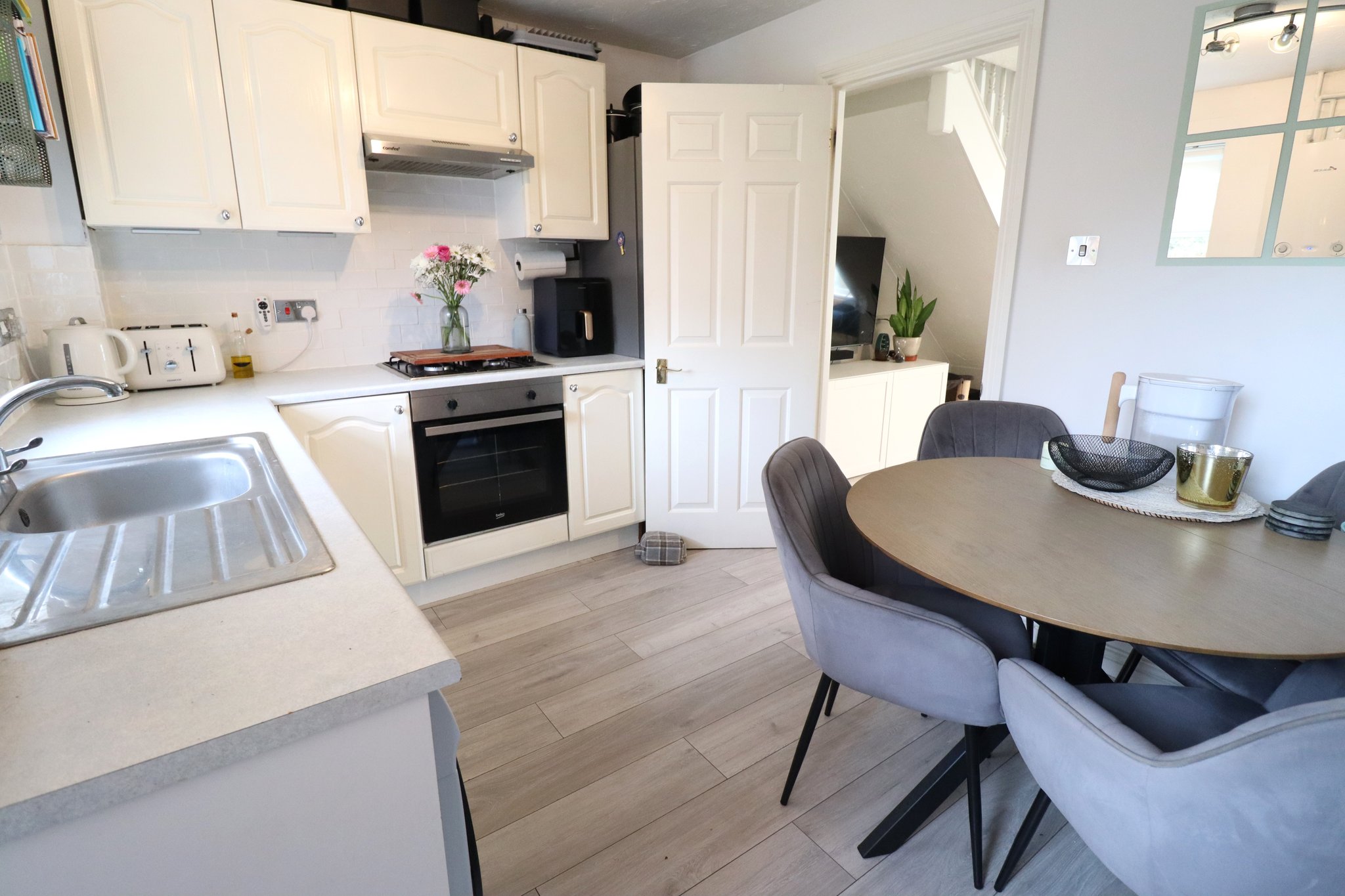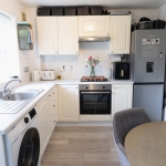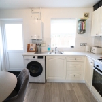 12' 8" x 8' 8" (3.86m x 2.64m) Fitted Kitchen with Ample Wall and Base Units; Space for Washing Machine and Fridge/Freezer; Integrated Electric Oven, Gas Hob, Extractor Fan. Mixer Tap to Stainless Steel Sink; Laminate Flooring; Tiled Splashbacks; Radiator; Ceiling Light Fittings; Double Glazed Window and PVC Door to Rear Garden; New Boiler Installed November 2024.