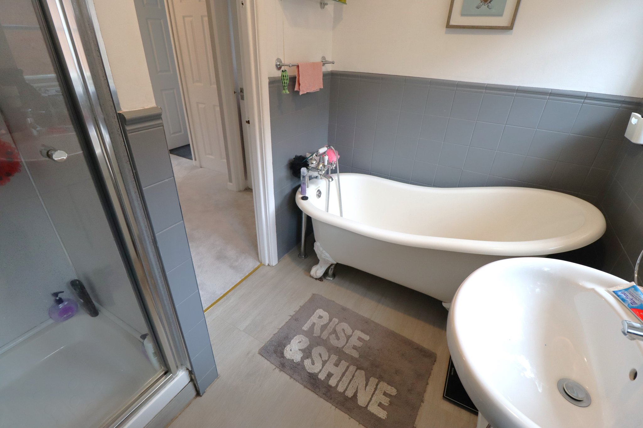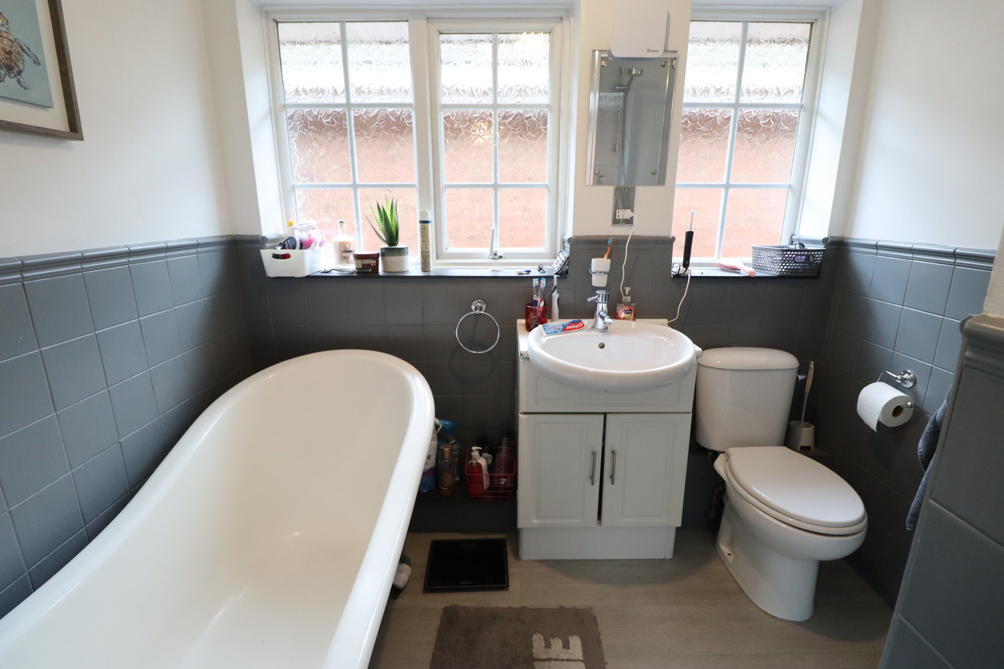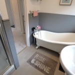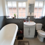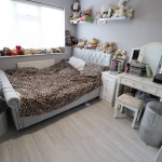 7' 9" x 5' 5" expanding 7' into shower cubicle. Two UPVC obscure double glazed Georgian style windows to side aspect. Smooth plastered ceiling with ceiling light point. Suite comprises of an enclosed shower cubicle with thermostatic mixer shower inset. Close coupled WC, wash basin with mixer tap inset to vanity storage unit, free standing rolled edge bath with antique style mixer tap with shower attachment. Tiled walls at half height. Wood laminate flooring laid throughout. Wall mounted chrome heated towel rail.