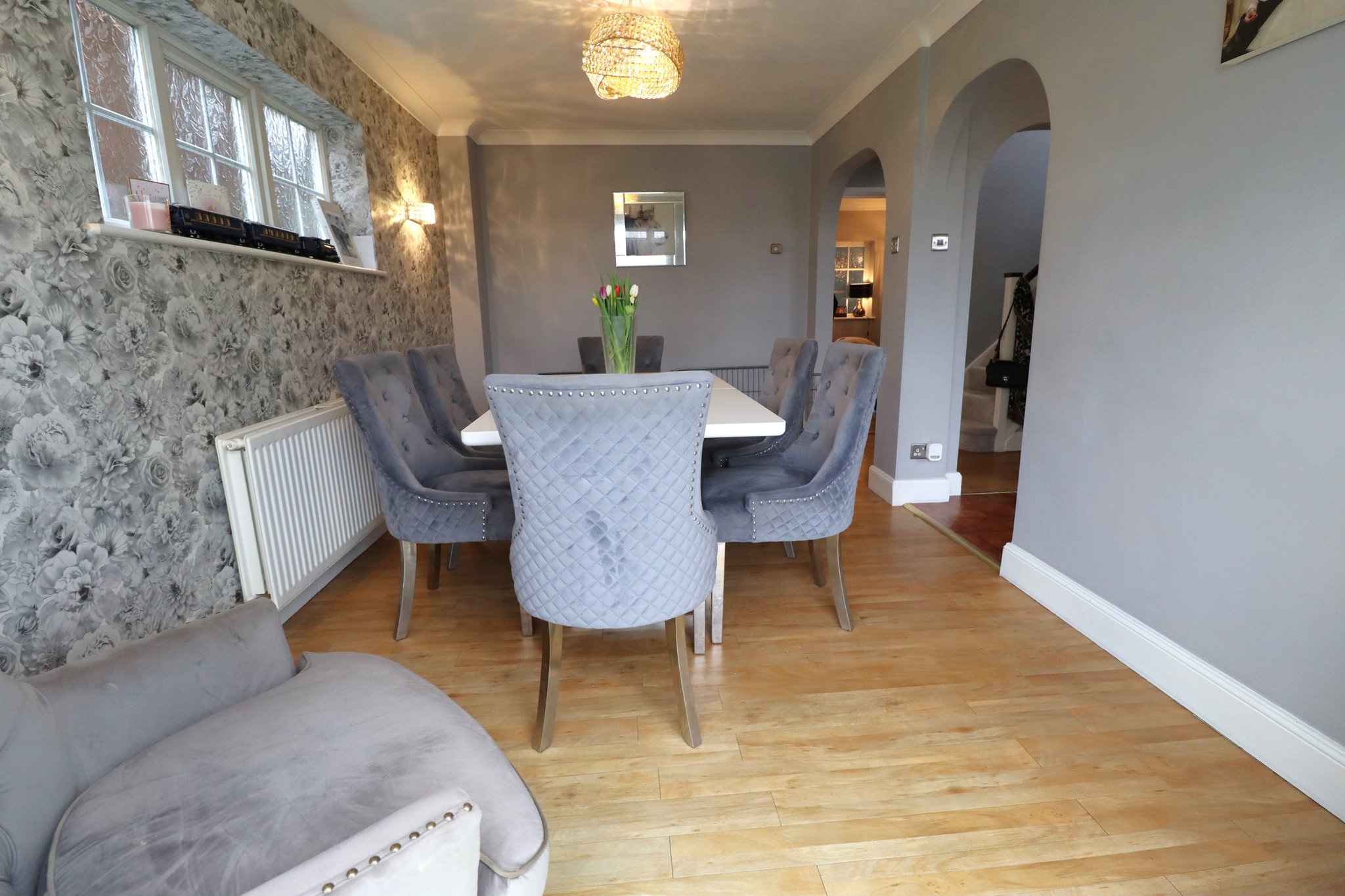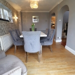 5' 9" x 5' 5" (1.75m x 1.65m) Smooth plastered coved ceiling with ceiling light point. Carpeted return staircase rising to first floor with large UPVC double glazed obscure window at half landing. Built in under stairs storage cupboard. Oak flooring laid throughout extending to dining room via archway.