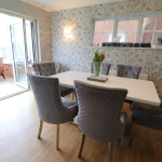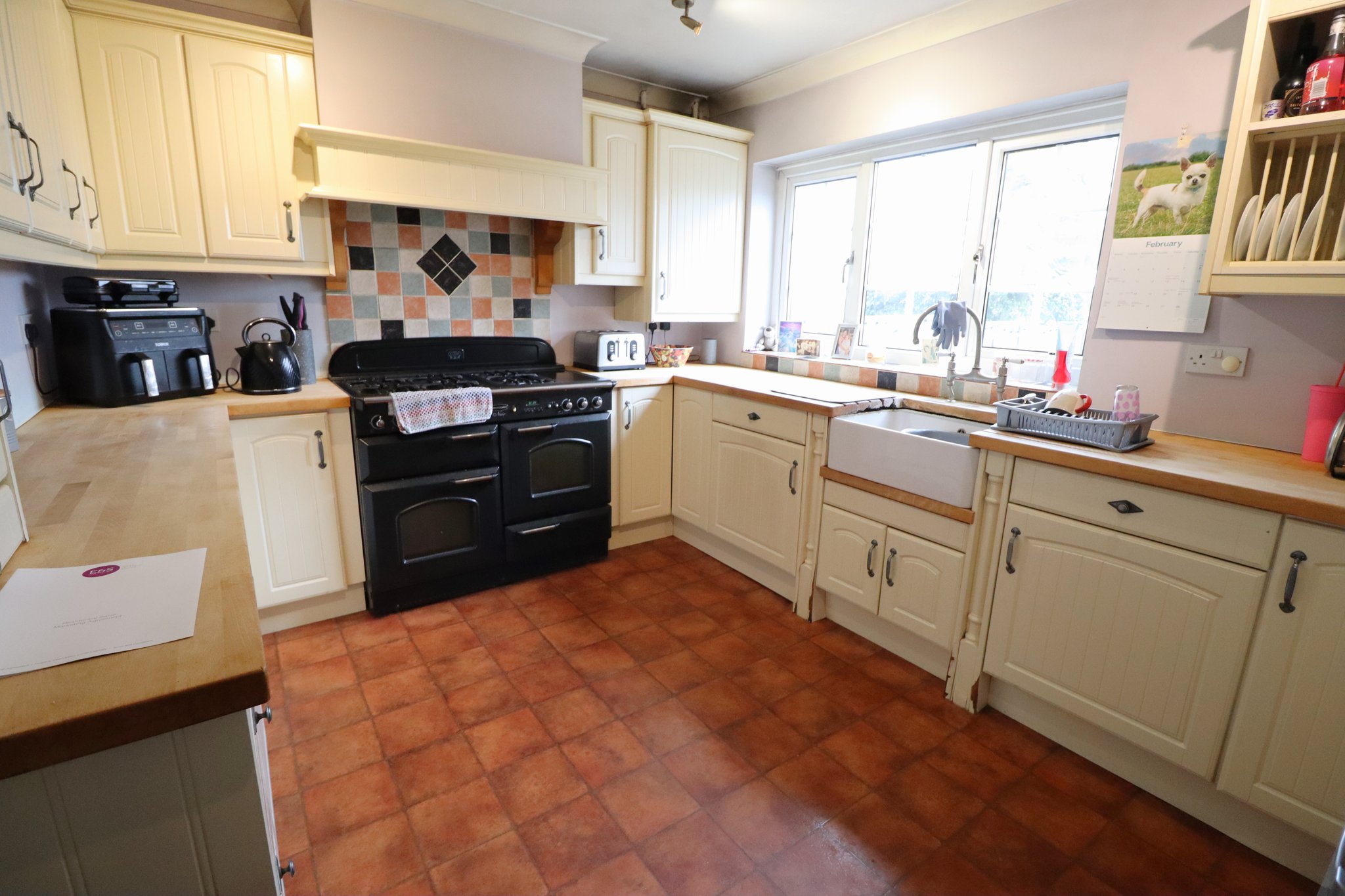 12' 3" x 9' 11" (3.73m x 3.02m) UPVC double glazed Georgian style windows to rear aspect overlooking garden. Smooth plastered coved ceiling with four independent ceiling light points. Wall mounted concealed Worcester boiler. Farmhouse style kitchen comprises a range of wall mounted and base level kitchen cabinet units and drawers with solid Oak worktops incorporating a ceramic Butler sink with mixer tap over. Space for a Range style double oven with extractor over with pelmet finish design. Integral dishwasher, space for free standing fridge/freezer.