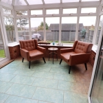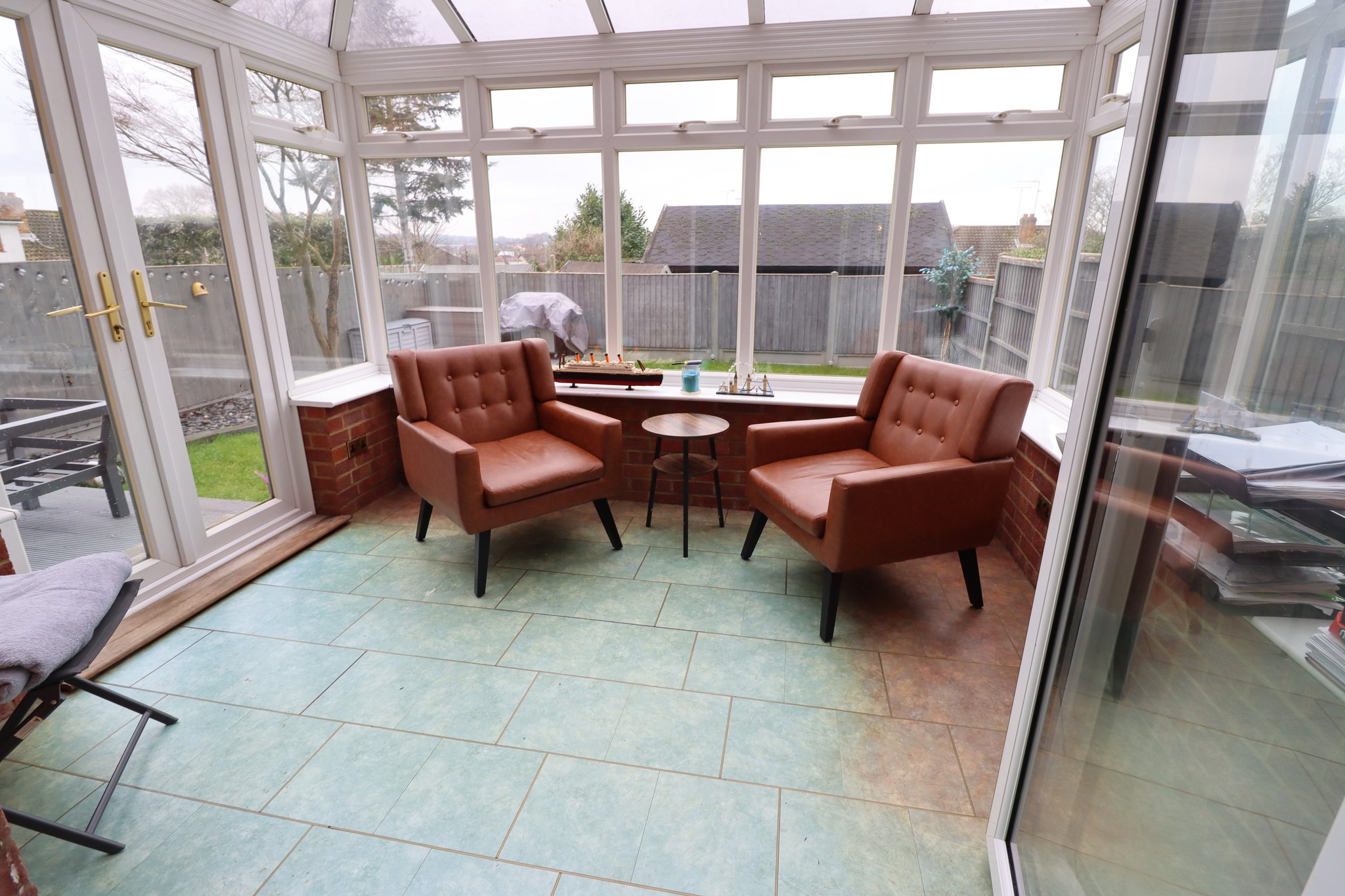 10' 5" x 8' 3" (3.17m x 2.51m) UPVC double glazed Victorian style pitched roof conservatory with ceiling light fan. Double doors opening to garden. Amtico vinyl tile flooring laid throughout.