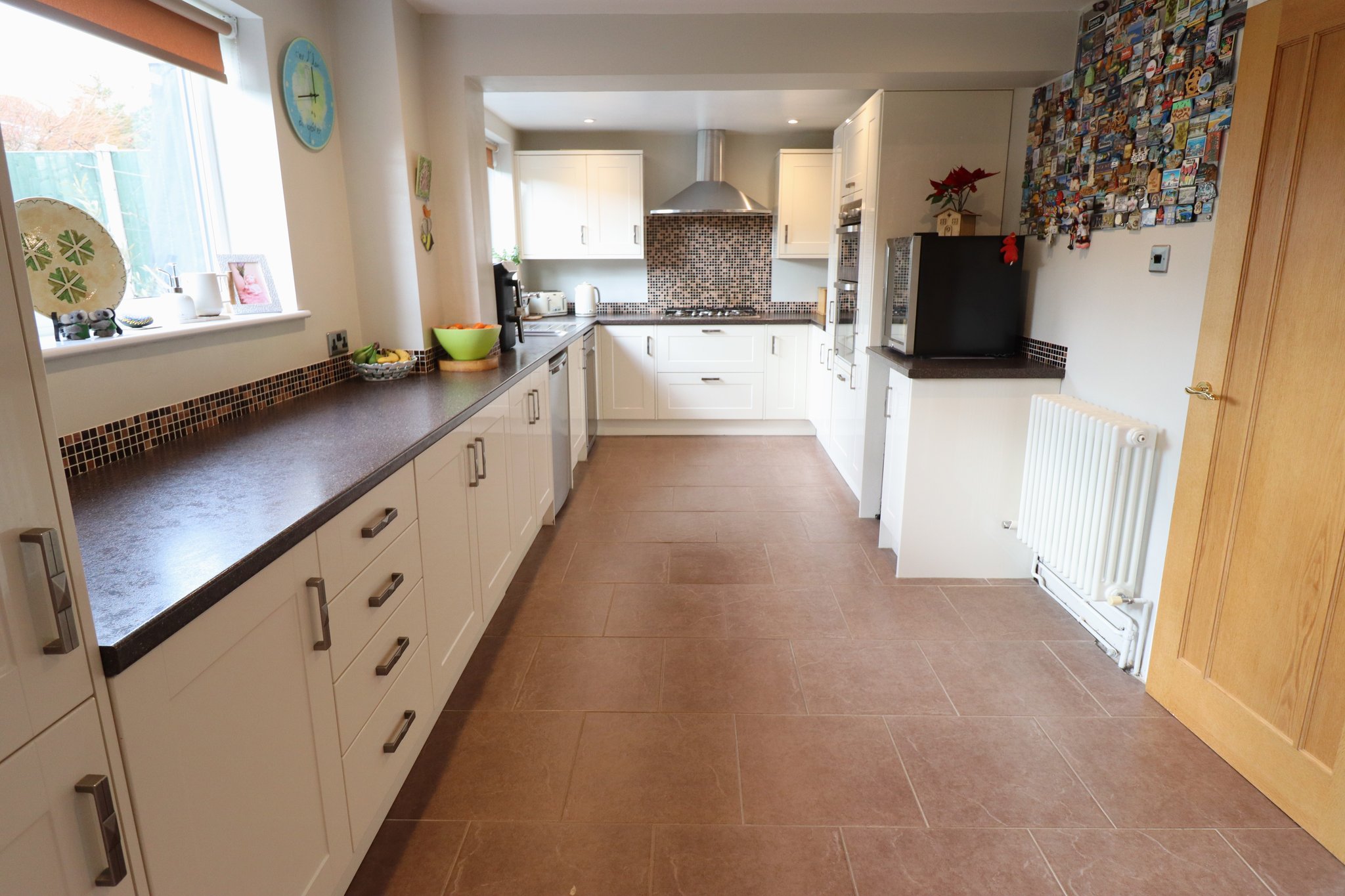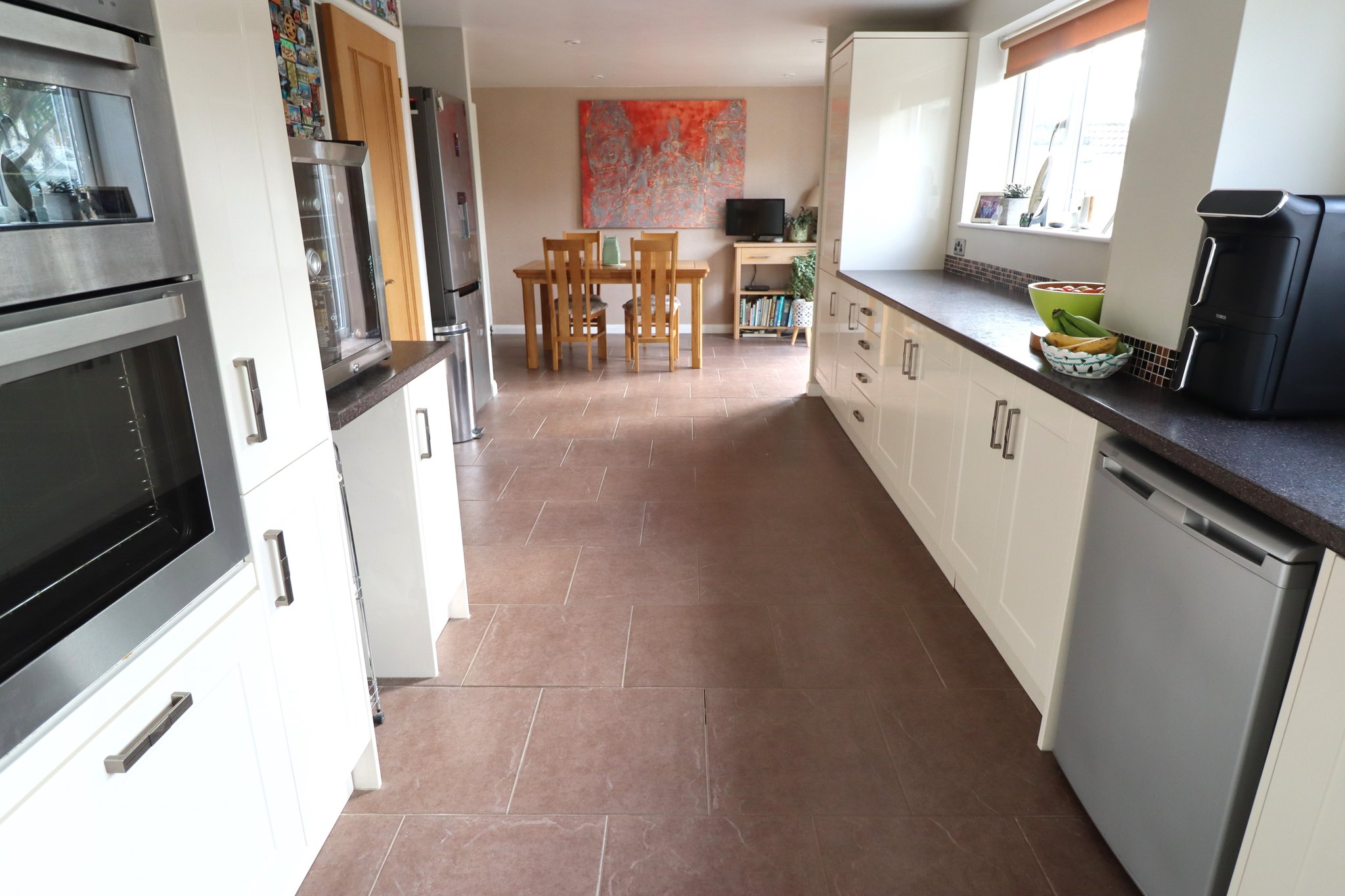 28' 0" x 11' 7" (8.53m x 3.53m) Both impressive and expansive, this exceptional open-plan kitchen/dining is ideal for showcasing your culinary and hosting skills. Absolutely beautiful, light, bright kitchen boasting an abundance of fitted units, to include: Wall and base units; Drawers; Deep pan drawers; Full-height storage cupboards. Integrated appliances include; Gas hob; Chimney extractor fan; Double electric oven; Mixer tap to one and a half bowl sink. Space for fridge/freezer and dishwasher. Double glazed window to rear; Ceiling spot lights; Tiled flooring; Modern vertical and horizontal radiators; French doors leading to rear garden.
