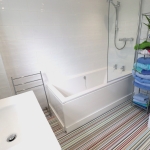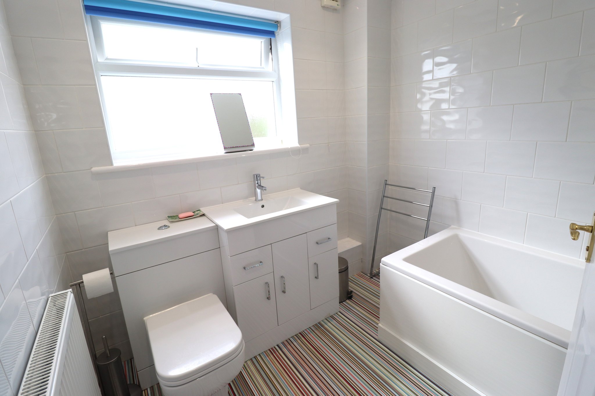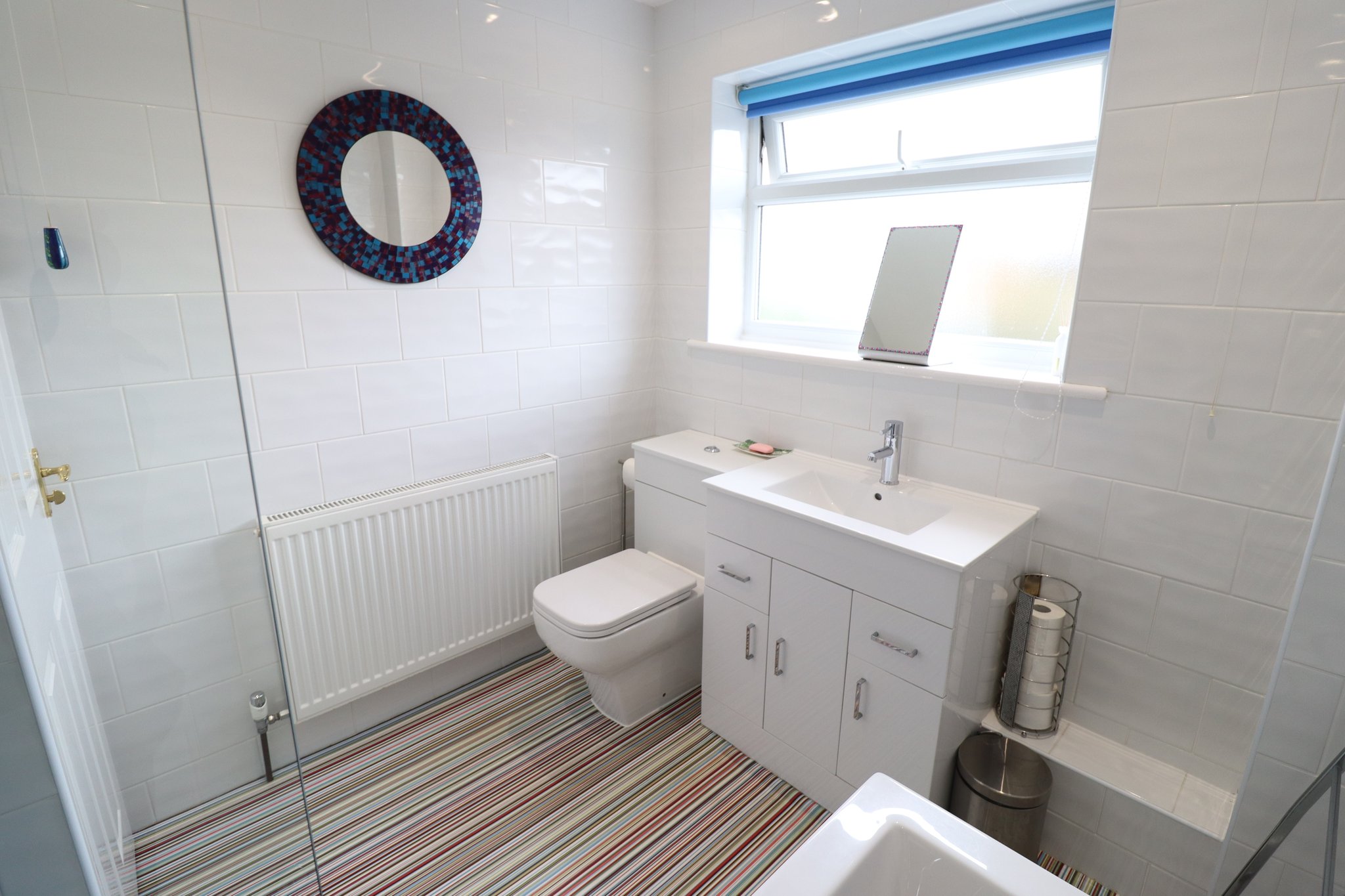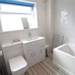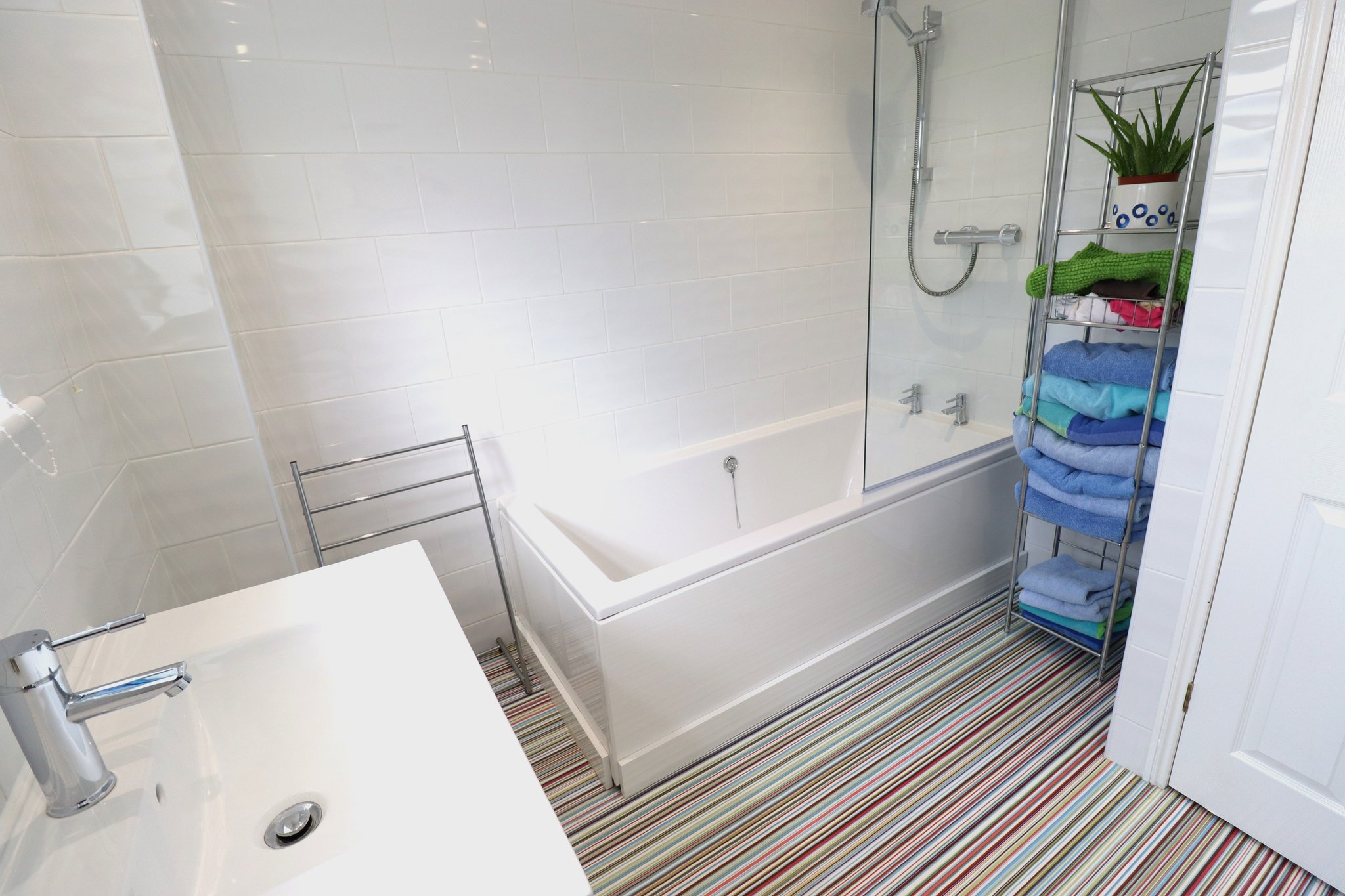 7' 2" x 6' 2" (2.18m x 1.88m) Stylish three-piece suite comprising of: Hot and cold taps to panel bath; Wall-mounted shower; Glass shower screen; Mixer tap to vanity basin; WC. Radiator; Double glazed window; Ceiling spot lights.