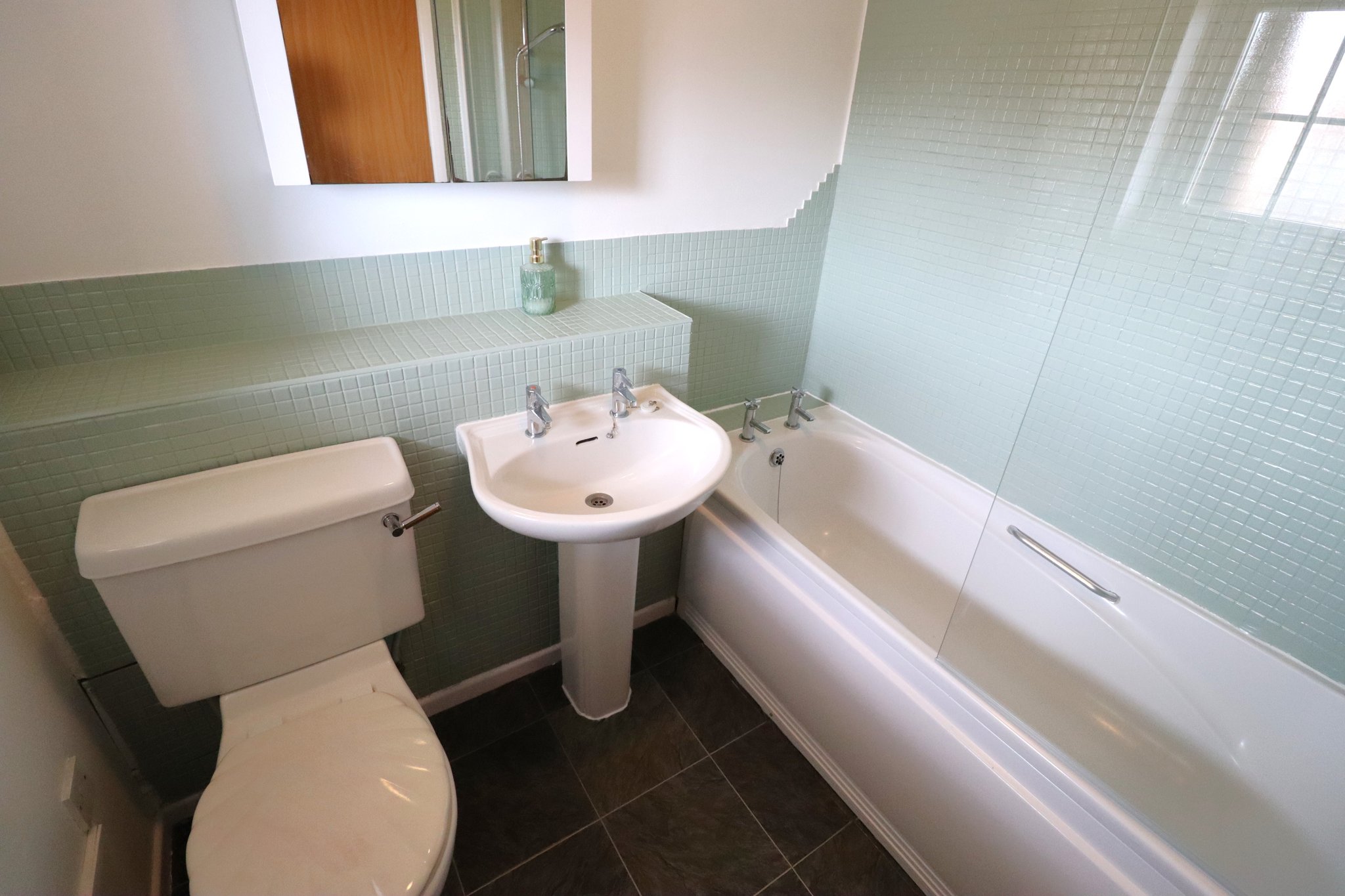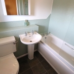 Obscure UPVC double glazed Georgian style window to front. Ceiling light point. Suite comprises of a panelled bath with mosaic style wall tiles, extending to the remaining sanitary areas. Thermostatic mixer shower over with glass pivoting shower screen. Pedestal wash basin and close coupled WC. Wall mounted electric heater/towel rail. Amtico vinyl tiled flooring laid throughout.