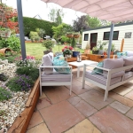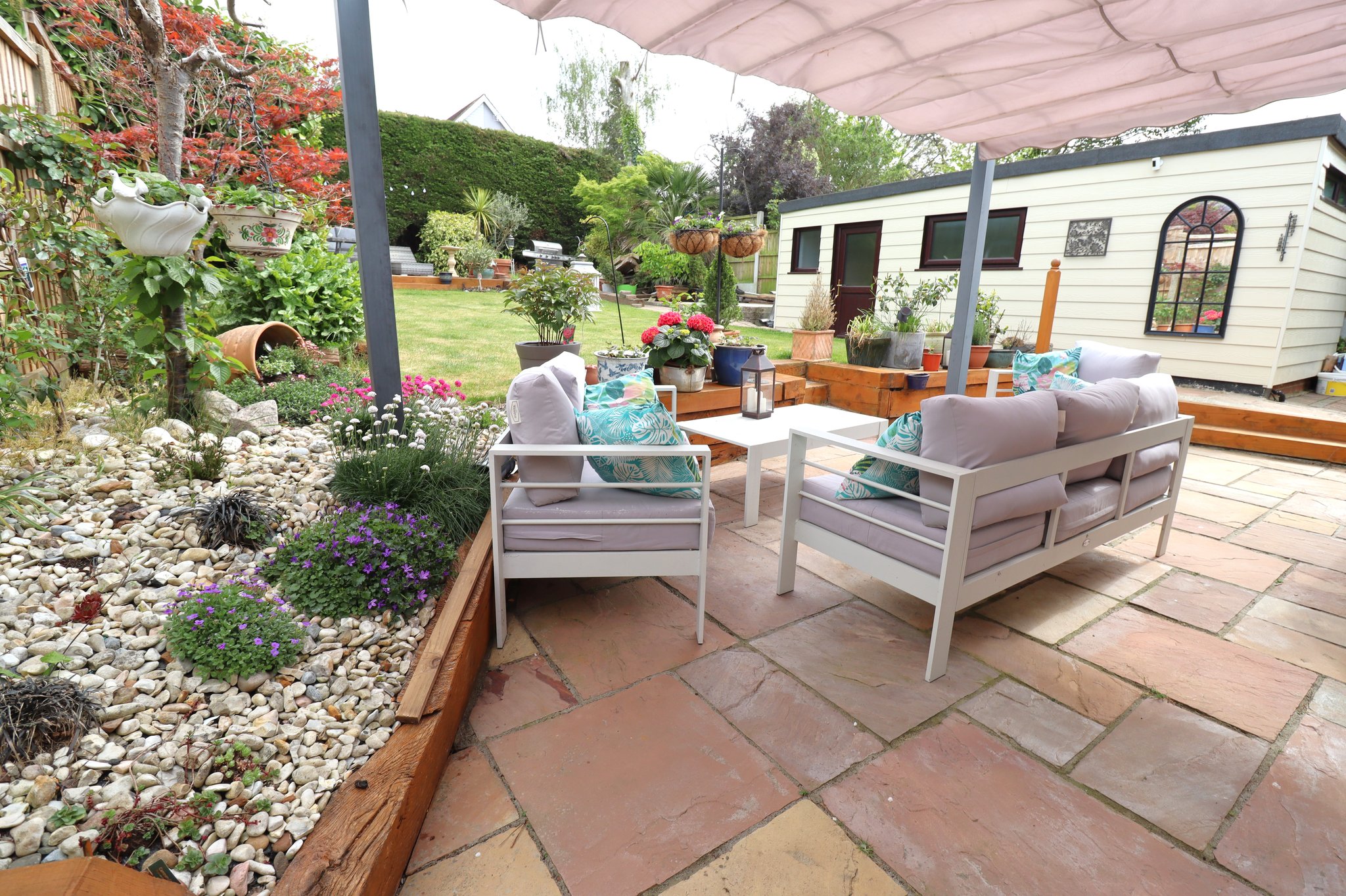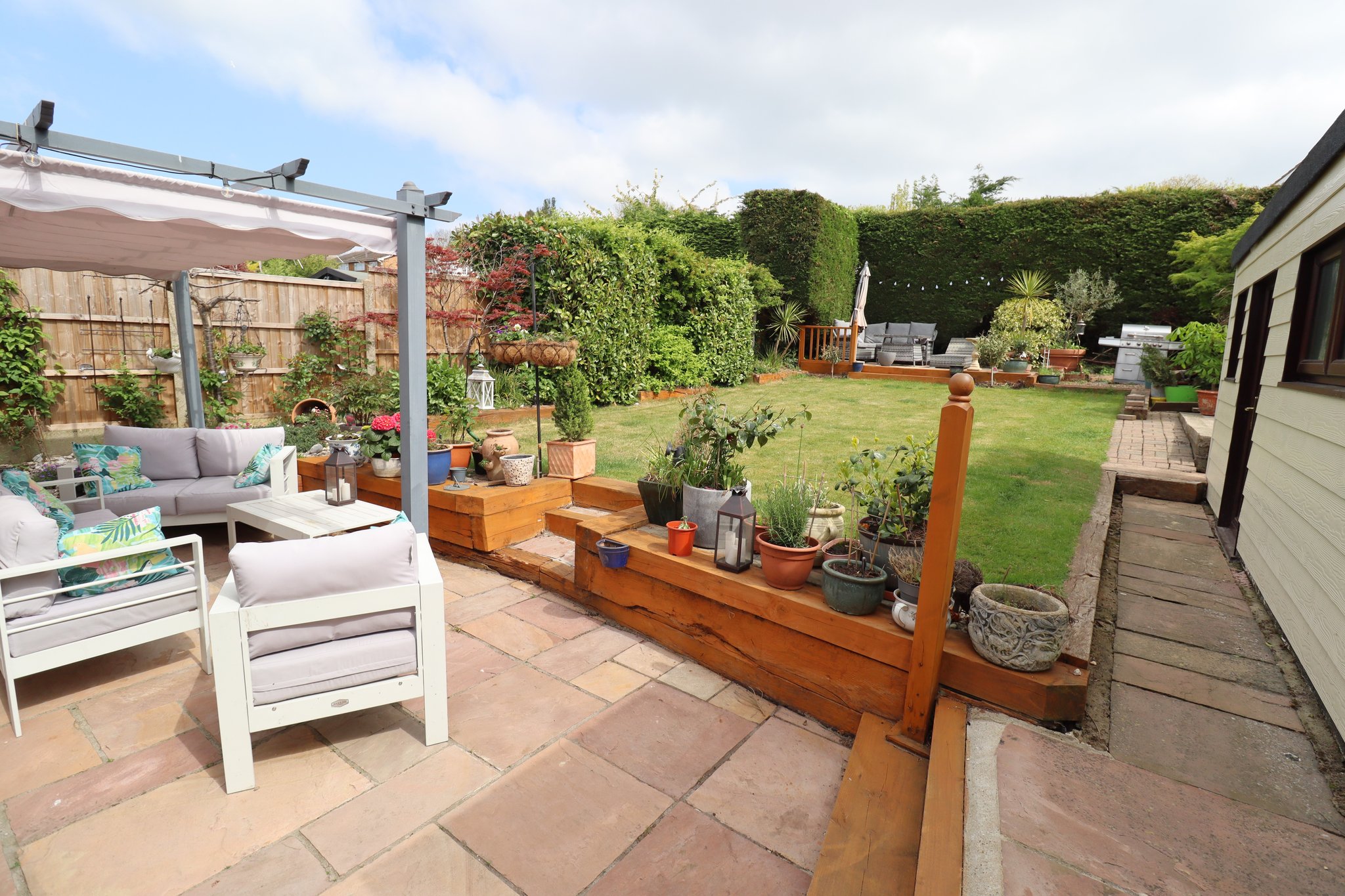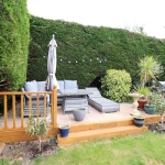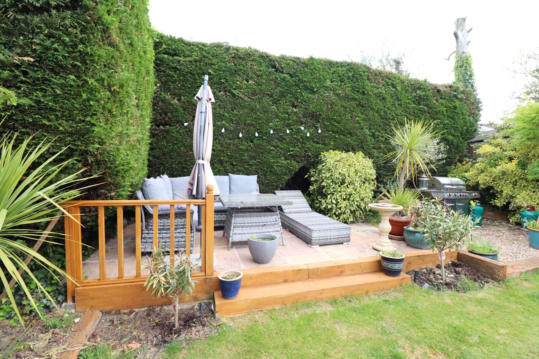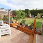 Commences with a large Indian Sandstone patio area with fitted pergola over. Raised feature railway sleeper border flower bed, which steps up to the main lawn. Block paving to side giving dual side access to front and driveway. Remainder of the garden with an array of mature shrubs, trees, laurels & conifers. Feature raised decked area to the far end with timber balustrade and continuation of Indian Sandstone paving. Timber fenced boundaries to all visible aspects. Additional hardstanding for shed etc.