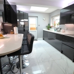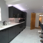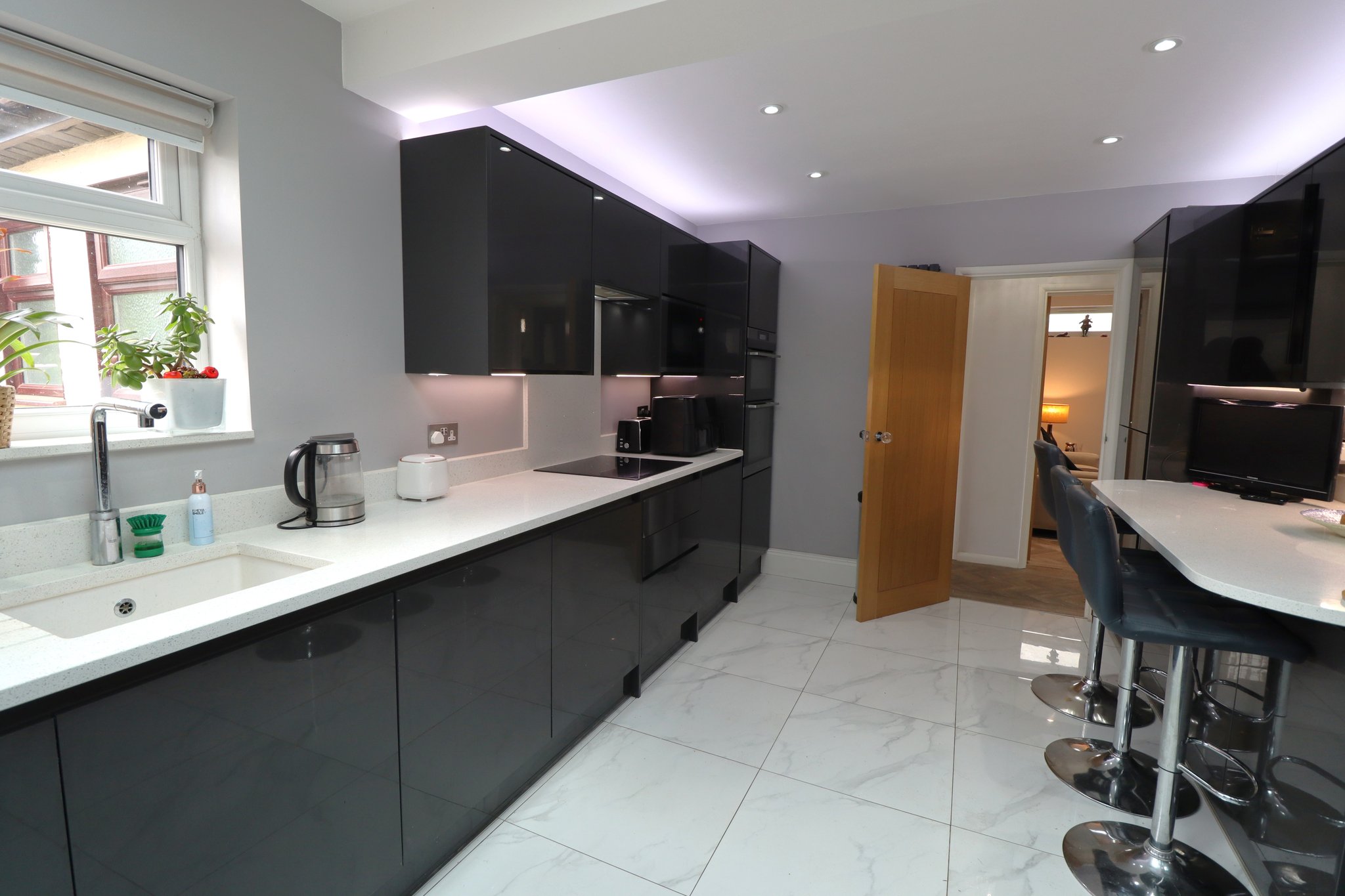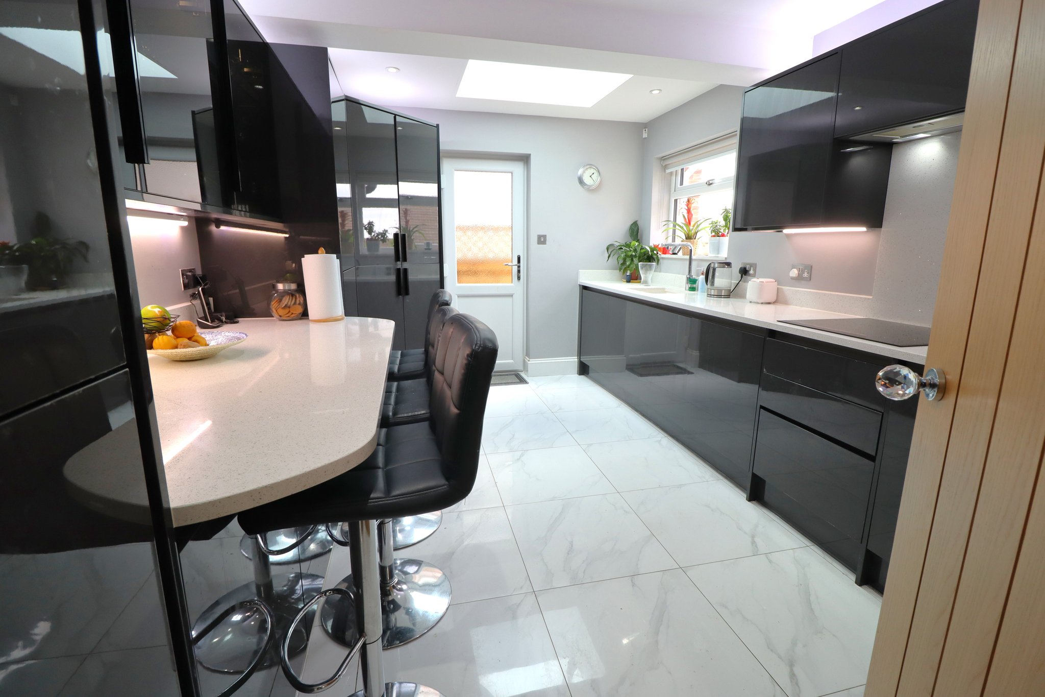 14' 5" x 10' 2" (4.39m x 3.10m) UPVC double glazed window to front aspect. Feature double glazed roof latern. Obsure glass double glazed side door to garden and front access. Smooth lastered cieling with inset LED spotlighting throughout. Contemporary kitchen comprising with a range of wall mounted and base level handeless gloss kitchen cabinet units and drawers and feature smoked glass display cabinets. Quartz worktops including an enlarged breakfast bar area with storage cupboards beneath. Ceramic sink with mixer tap/hot tap over. Four ring AEG induction hob. Integral AEG oven & grill and integral Bosch microwave. Integral full height fridge and full height freezer. Built in larder. Integral dishwasher and integral washer/dryer. Marble effect porcelian tiled floor throughout.