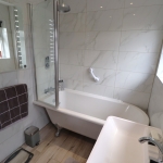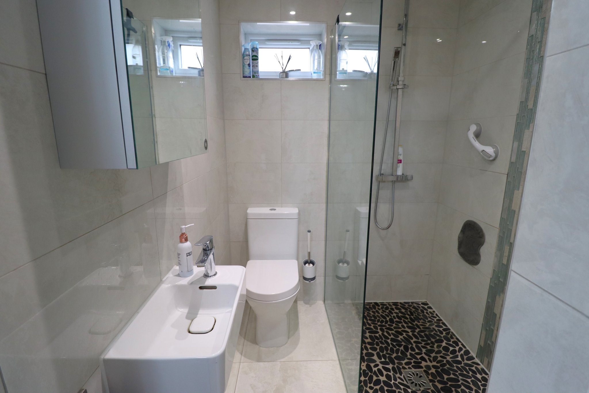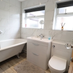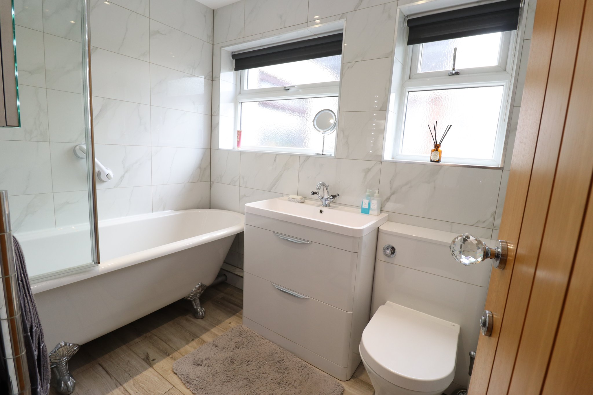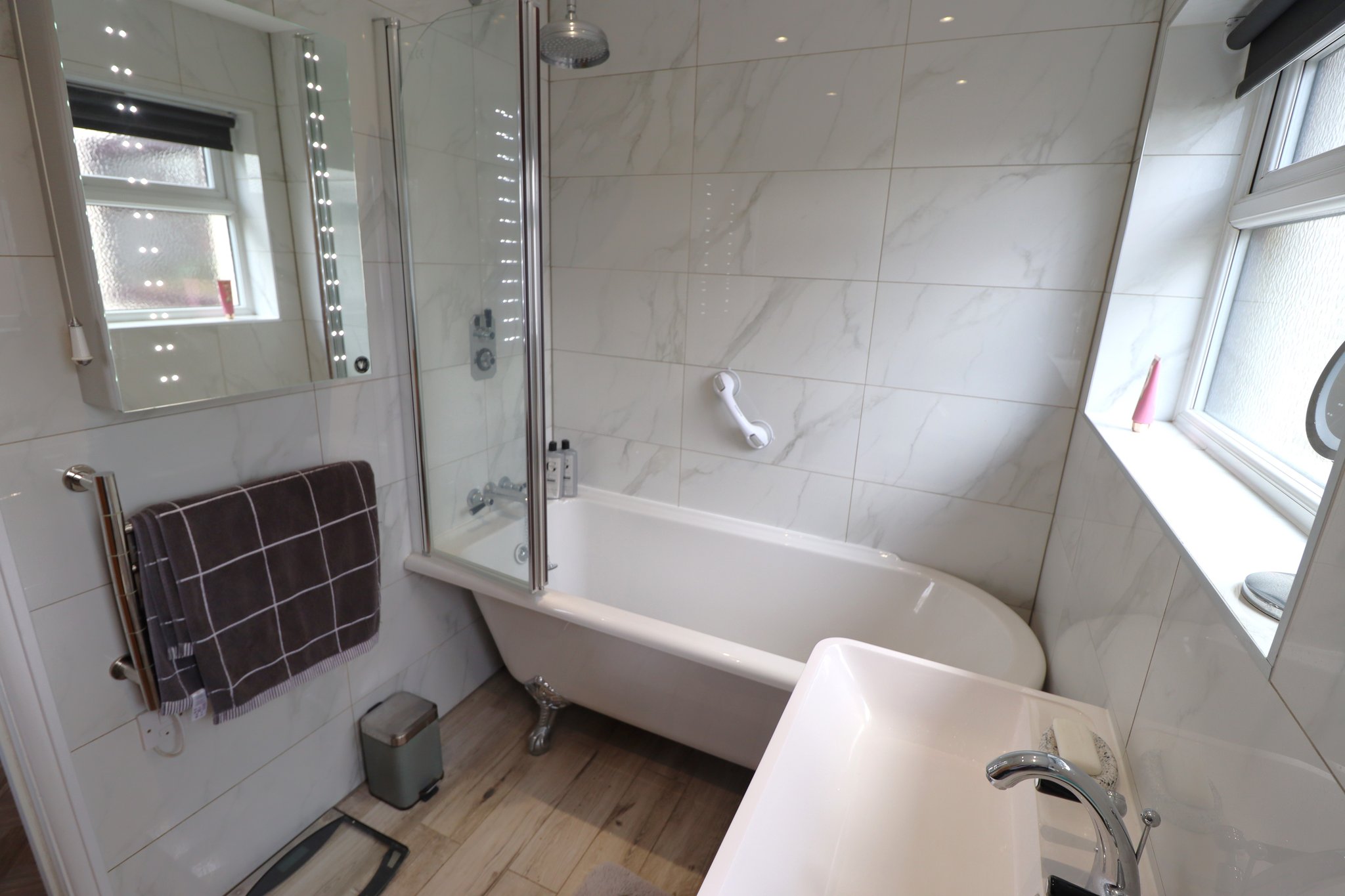 7' 6" x 5' 6" (2.29m x 1.68m) Two obscure UPVC double glazed windows to side aspect. Smooth plastered ceiling with inset LED spotlights. Marble effect tiled walls and feature contrasting woodgrain ceramic tiled flooring. Suite comprises of a free standing roll top bath with glass folding shower screen and rainfall shower head over with inset thermostatic shower controls, and seperate bath mixer taps. Enlarged washbasin with mixer tap inset to vanity storage unit and a concealed cistern push flush WC. Crome heated towel rail.