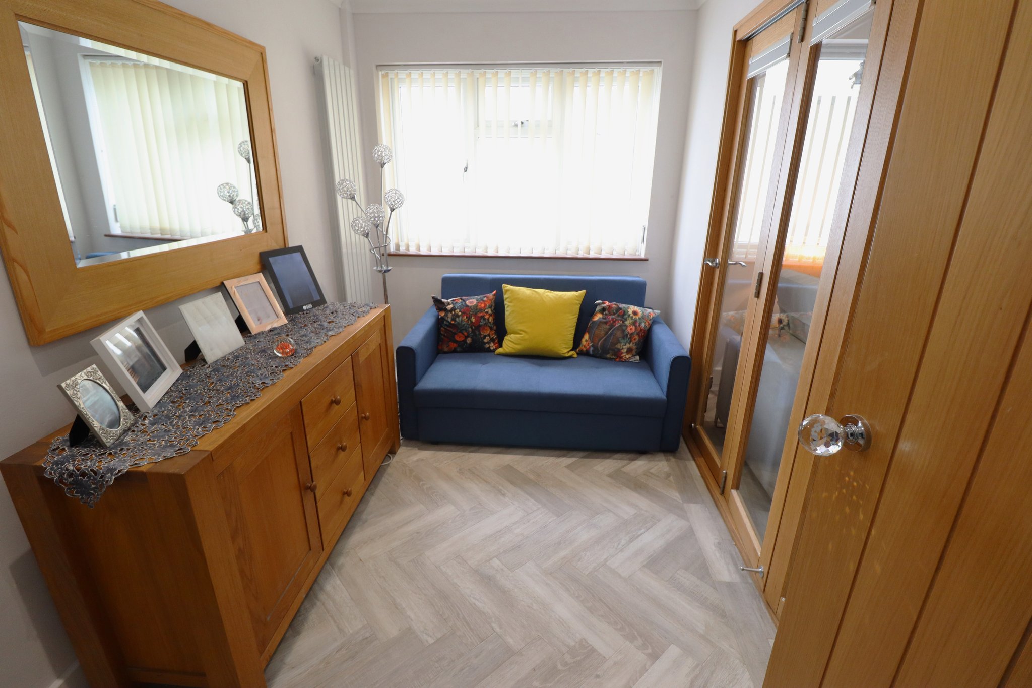 10' 11" x 6' 10" (3.33m x 2.08m) Dual access from hallway via internal Oak door and feature Oak fitted bi-fold internal doors to living room. UPVC double glazed window to side aspect. Smooth plastered coved ceiling with LED spotlighting. Feature contemporary vertical flat panelled radiator. Amtico herringbone luxury vinyl flloring throughout.