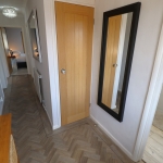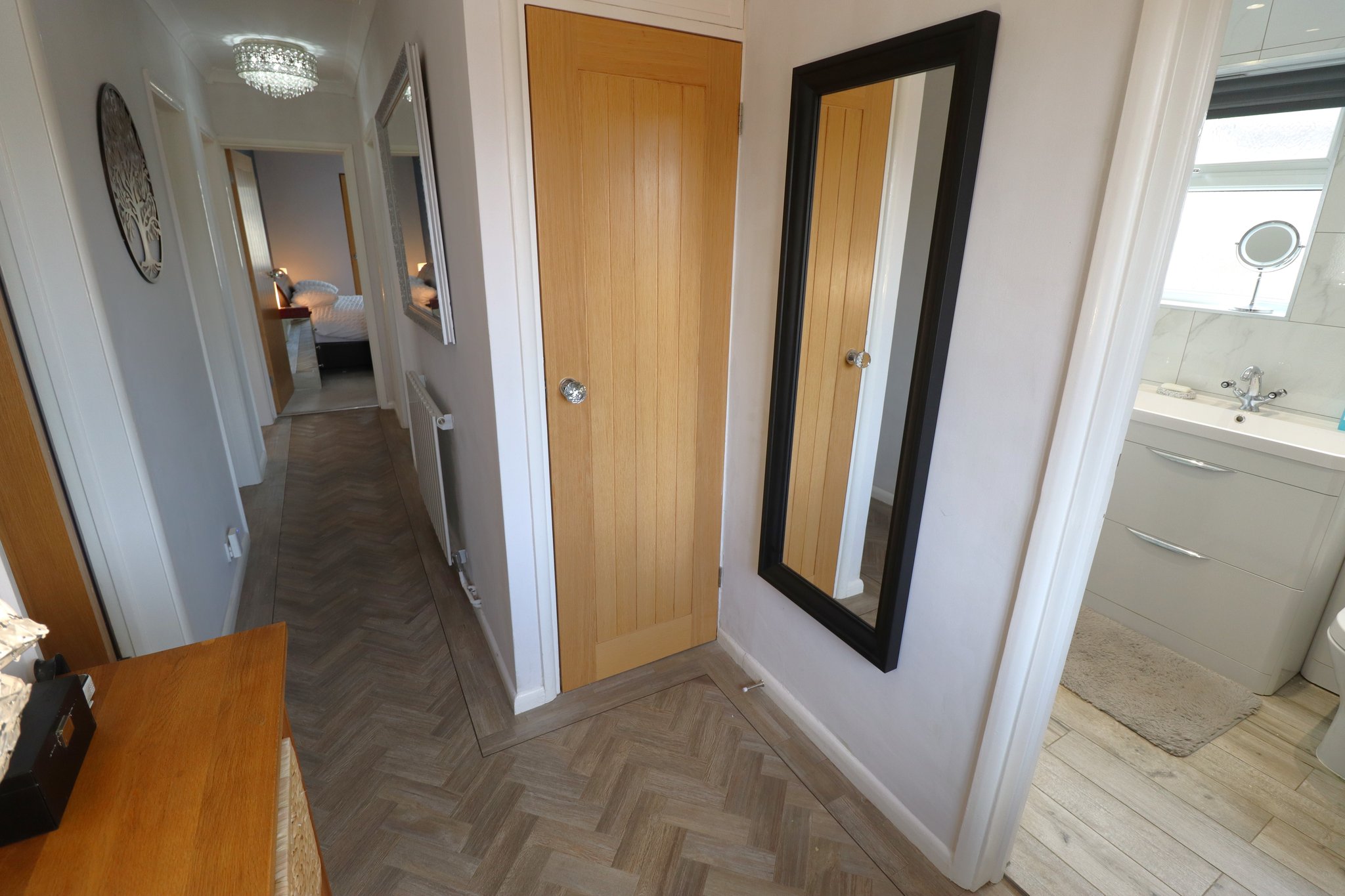 18' 7" x 5' 4" narrowing into 2'11''. Smooth plastered coved ceiling with two ceiling light points and pull down loft hatch with loft ladder and majority of loft boarded with access to combi boiler. Built in cloaks storage cupboard. Wall mounted feature contemporary panelled radiator. Amtico herringbone luxury vinyl flooring.